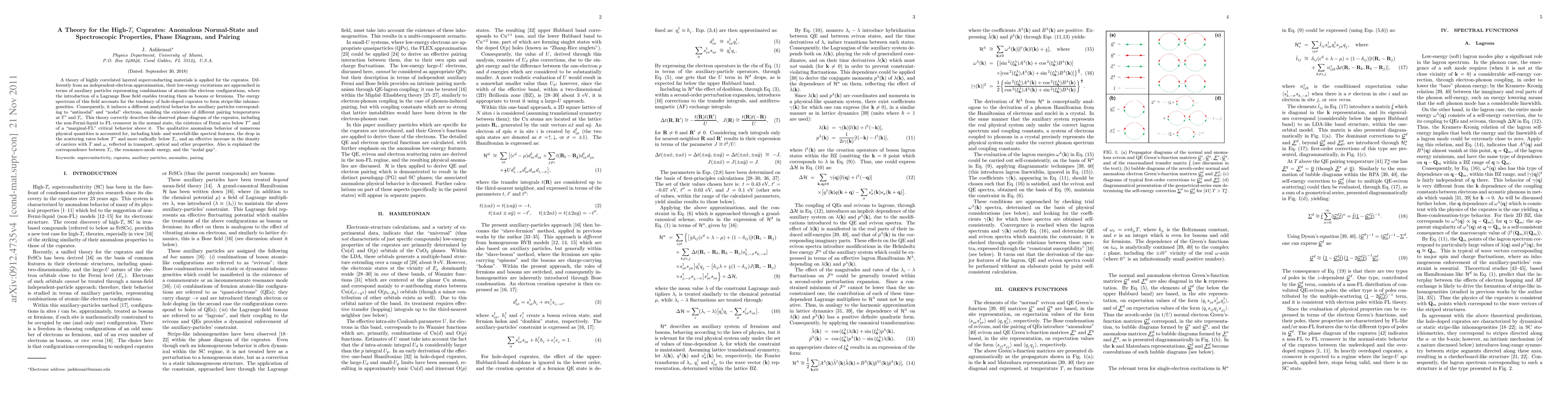 This paper proposes a theory for high-temperature superconductivity in cuprates, using auxiliary particles to describe low-energy excitations beyond an independent-electron model. It explains the phase diagram, anomalous normal-state properties, and pairing mechanisms, including different pairing temperatures and the observed spectral features.