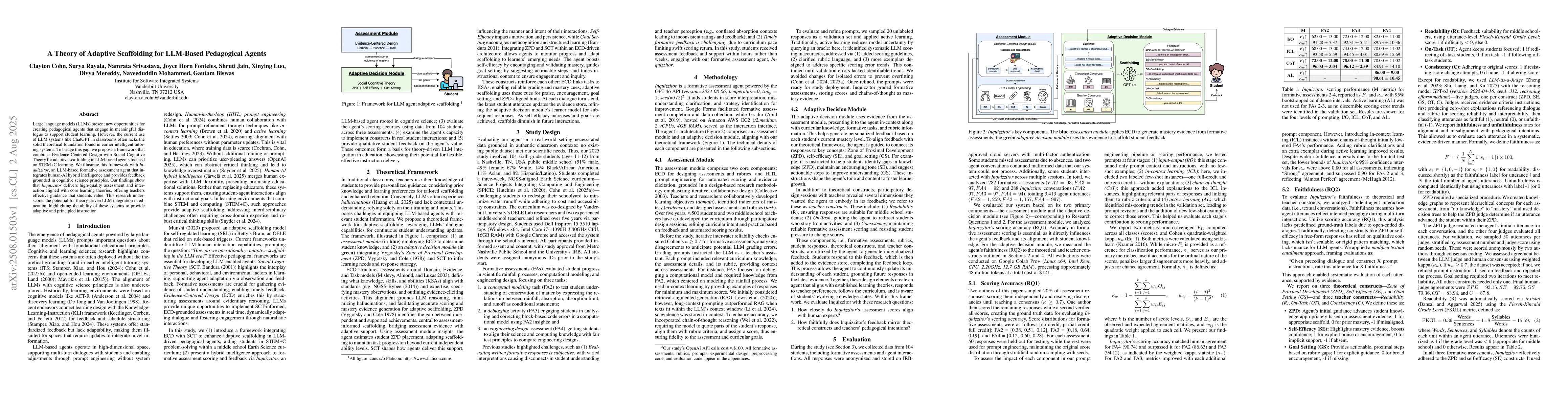 Large language models (LLMs) present new opportunities for creating pedagogical agents that engage in meaningful dialogue to support student learning. However, the current use of LLM systems like ChatGPT in classrooms often lacks the solid theoretical foundation found in earlier intelligent tutoring systems. To bridge this gap, we propose a framework that combines Evidence-Centered Design with Social Cognitive Theory for adaptive scaffolding in LLM-based agents focused on STEM+C learning. We illustrate this framework with Inquizzitor, an LLM-based formative assessment agent that integrates human-AI hybrid intelligence and provides feedback grounded in cognitive science principles. Our findings show that Inquizzitor delivers high-quality assessment and interaction aligned with core learning theories, offering teachers effective guidance that students value. This research underscores the potential for theory-driven LLM integration in education, highlighting the ability of these systems to provide adaptive and principled instruction.