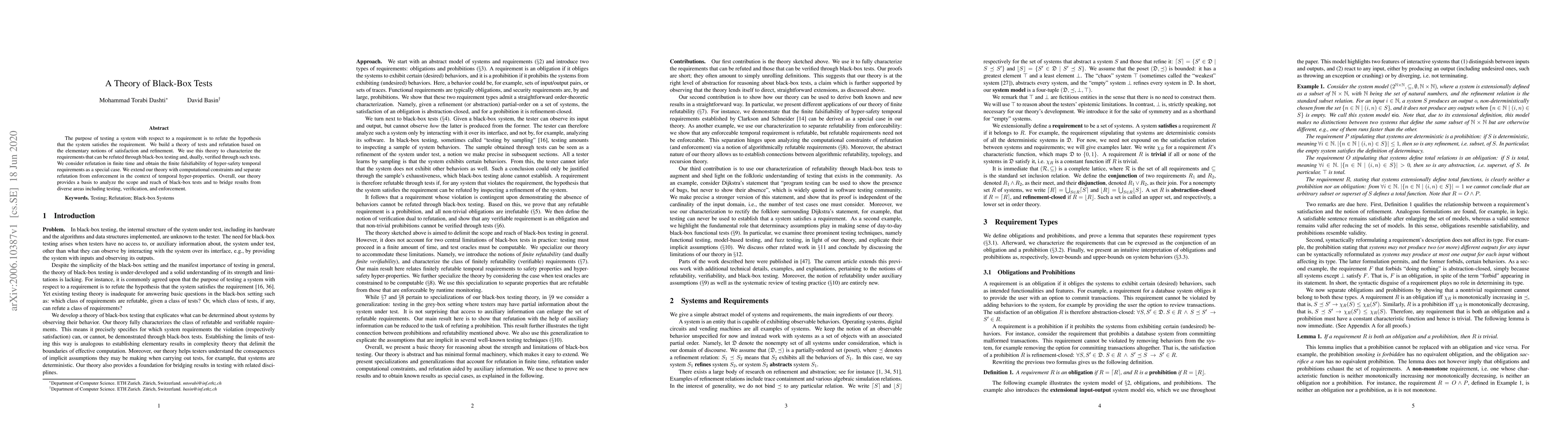 The purpose of testing a system with respect to a requirement is to refute the hypothesis that the system satisfies the requirement. We build a theory of tests and refutation based on the elementary notions of satisfaction and refinement. We use this theory to characterize the requirements that can be refuted through black-box testing and, dually, verified through such tests. We consider refutation in finite time and obtain the finite falsifiability of hyper-safety temporal requirements as a special case. We extend our theory with computational constraints and separate refutation from enforcement in the context of temporal hyper-properties. Overall, our theory provides a basis to analyze the scope and reach of black-box tests and to bridge results from diverse areas including testing, verification, and enforcement.
