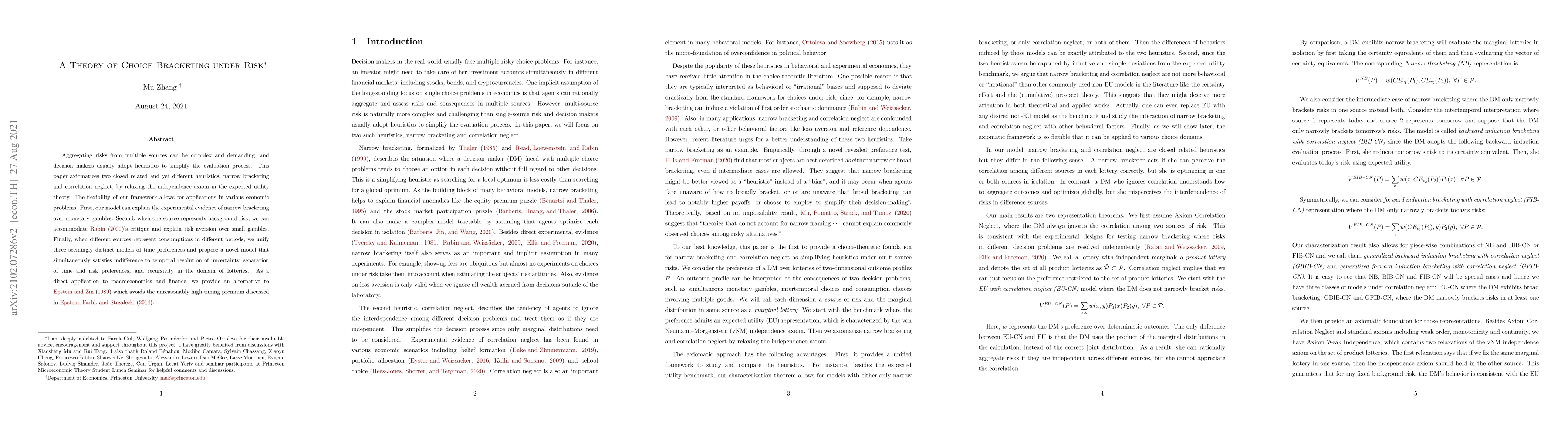 Aggregating risks from multiple sources can be complex and demanding, and decision makers usually adopt heuristics to simplify the evaluation process. This paper axiomatizes two closed related and yet different heuristics, narrow bracketing and correlation neglect, by relaxing the independence axiom in the expected utility theory. The flexibility of our framework allows for applications in various economic problems. First, our model can explain the experimental evidence of narrow bracketing over monetary gambles. Second, when one source represents background risk, we can accommodate Rabin (2000)'s critique and explain risk aversion over small gambles. Finally, when different sources represent consumptions in different periods, we unify three seemingly distinct models of time preferences and propose a novel model that simultaneously satisfies indifference to temporal resolution of uncertainty, separation of time and risk preferences, and recursivity in the domain of lotteries. As a direct application to macroeconomics and finance, we provide an alternative to Epstein and Zin (1989) which avoids the unreasonably high timing premium discussed in Epstein, Farhi, and Strzalecki (2014).