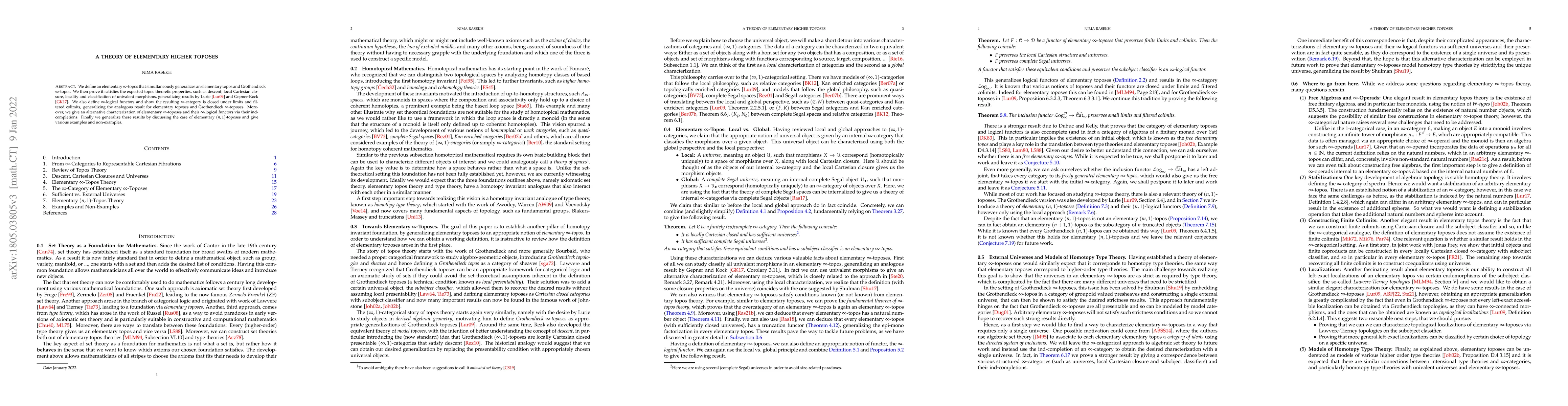 The paper defines an elementary $\infty$-topos that unifies elementary toposes and Grothendieck $\infty$-toposes, proving it satisfies topos-theoretic properties like descent and Cartesian closure. It also explores $\infty$-logical functors and ind-completions, providing an alternative characterization and examples of elementary $\infty$-toposes.