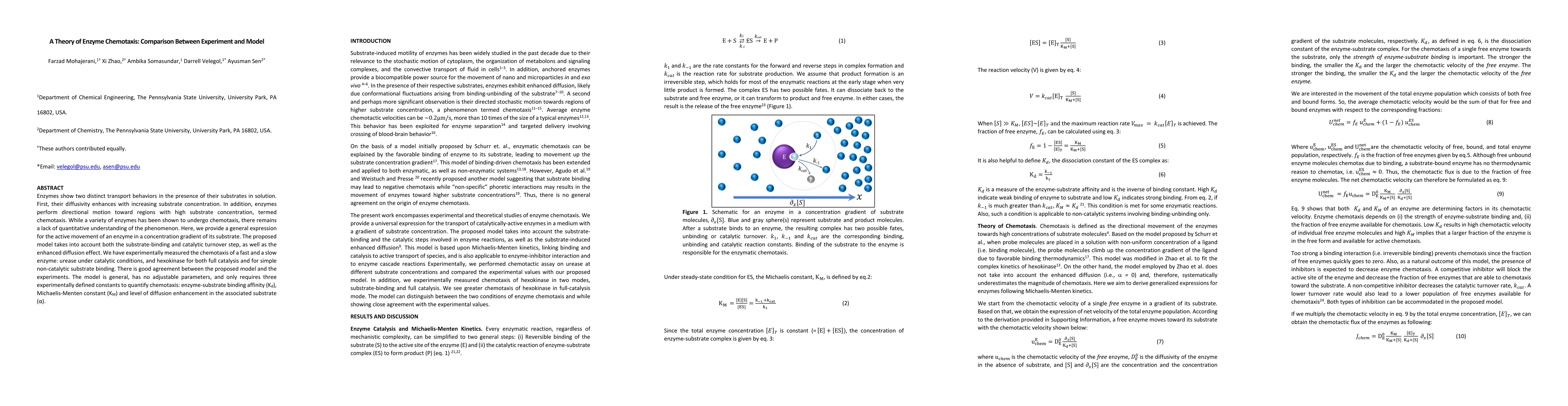 This paper proposes a theoretical model explaining enzyme chemotaxis, where enzymes move directionally towards higher substrate concentrations, and validates it through experiments on urease and hexokinase. The model accurately predicts enzyme behavior without adjustable parameters, relying on three experimentally determined constants.