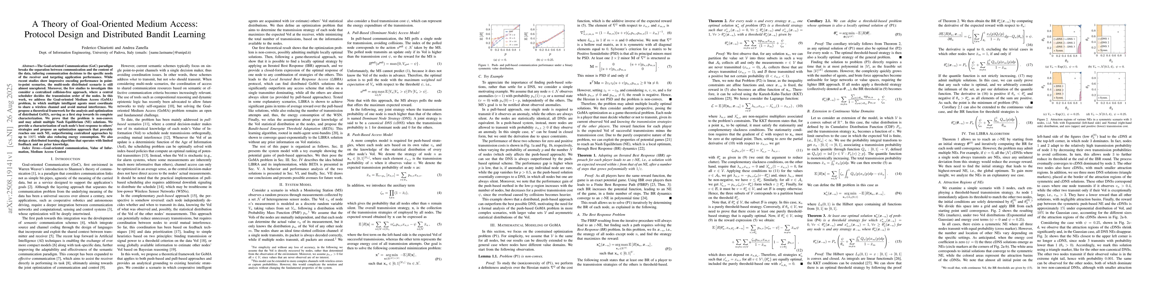 The Goal-oriented Communication (GoC) paradigm breaks the separation between communication and the content of the data, tailoring communication decisions to the specific needs of the receiver and targeting application performance. While recent studies show impressive encoding performance in point-to-point scenarios, the multi-node distributed scenario is still almost unexplored. Moreover, the few studies to investigate this consider a centralized collision-free approach, where a central scheduler decides the transmission order of the nodes. In this work, we address the Goal-oriented Multiple Access (GoMA) problem, in which multiple intelligent agents must coordinate to share a wireless channel and avoid mutual interference. We propose a theoretical framework for the analysis and optimization of distributed GoMA, serving as a first step towards its complete characterization. We prove that the problem is non-convex and may admit multiple Nash Equilibrium (NE) solutions. We provide a characterization of each node's best response to others' strategies and propose an optimization approach that provably reaches one such NE, outperforming centralized approaches by up to 100% while also reducing energy consumption. We also design a distributed learning algorithm that operates with limited feedback and no prior knowledge.