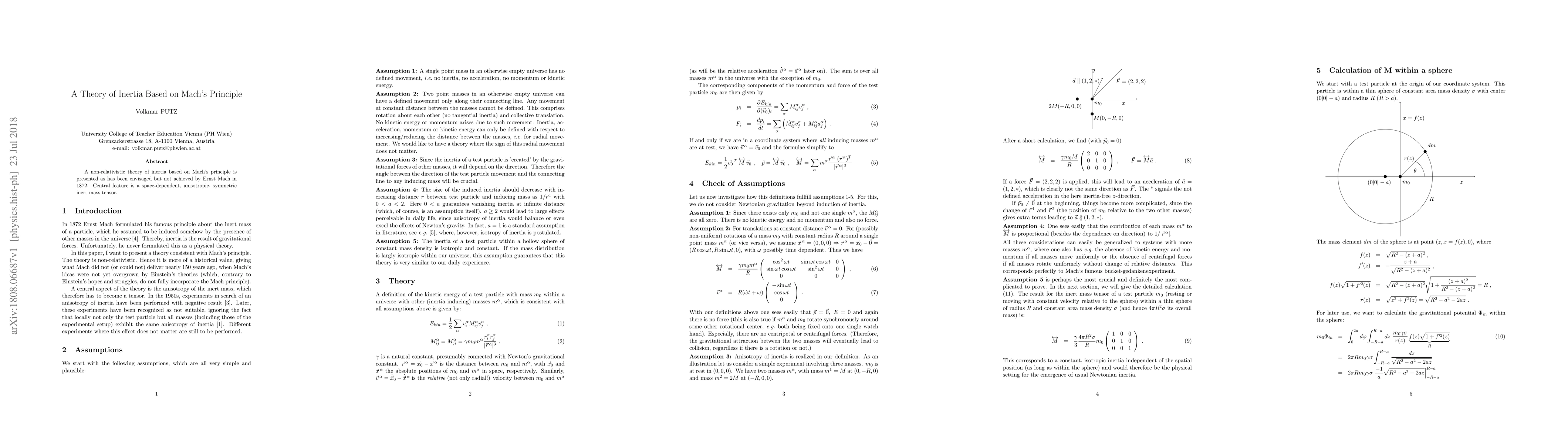 Summary: This paper proposes a non-relativistic inertia theory grounded in Mach's principle, featuring a space-dependent, anisotropic, symmetric inert mass tensor to fulfill Mach's 1872 vision. It aims to provide a new framework for understanding inertia.