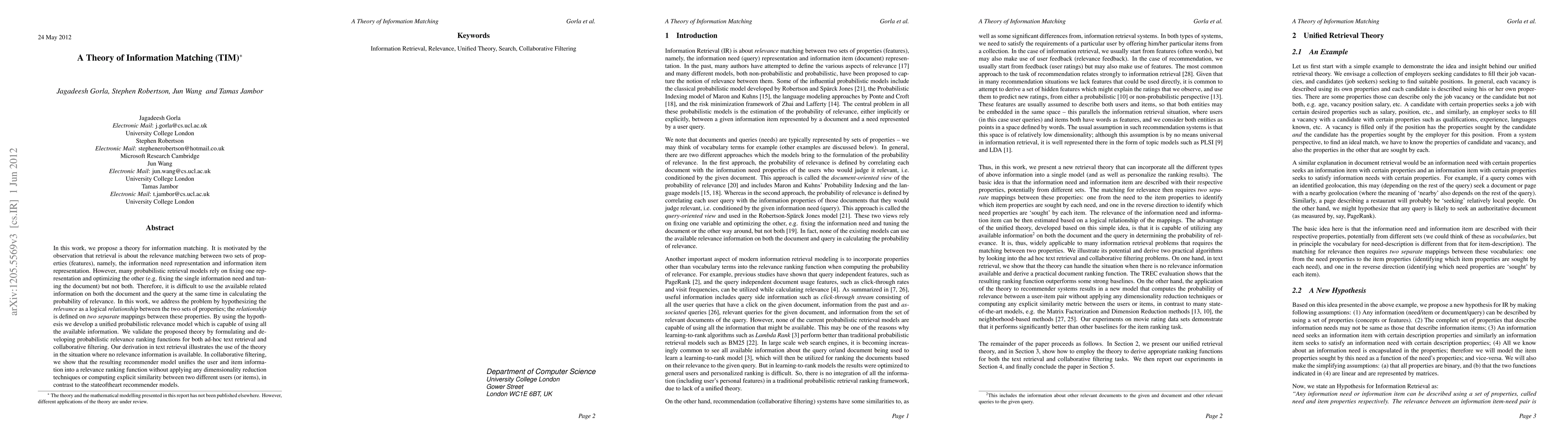 In this work, we propose a theory for information matching. It is motivated by the observation that retrieval is about the relevance matching between two sets of properties (features), namely, the information need representation and information item representation. However, many probabilistic retrieval models rely on fixing one representation and optimizing the other (e.g. fixing the single information need and tuning the document) but not both. Therefore, it is difficult to use the available related information on both the document and the query at the same time in calculating the probability of relevance. In this paper, we address the problem by hypothesizing the relevance as a logical relationship between the two sets of properties; the relationship is defined on two separate mappings between these properties. By using the hypothesis we develop a unified probabilistic relevance model which is capable of using all the available information. We validate the proposed theory by formulating and developing probabilistic relevance ranking functions for both ad-hoc text retrieval and collaborative filtering. Our derivation in text retrieval illustrates the use of the theory in the situation where no relevance information is available. In collaborative filtering, we show that the resulting recommender model unifies the user and item information into a relevance ranking function without applying any dimensionality reduction techniques or computing explicit similarity between two different users (or items), in contrast to the state-of-the-art recommender models.