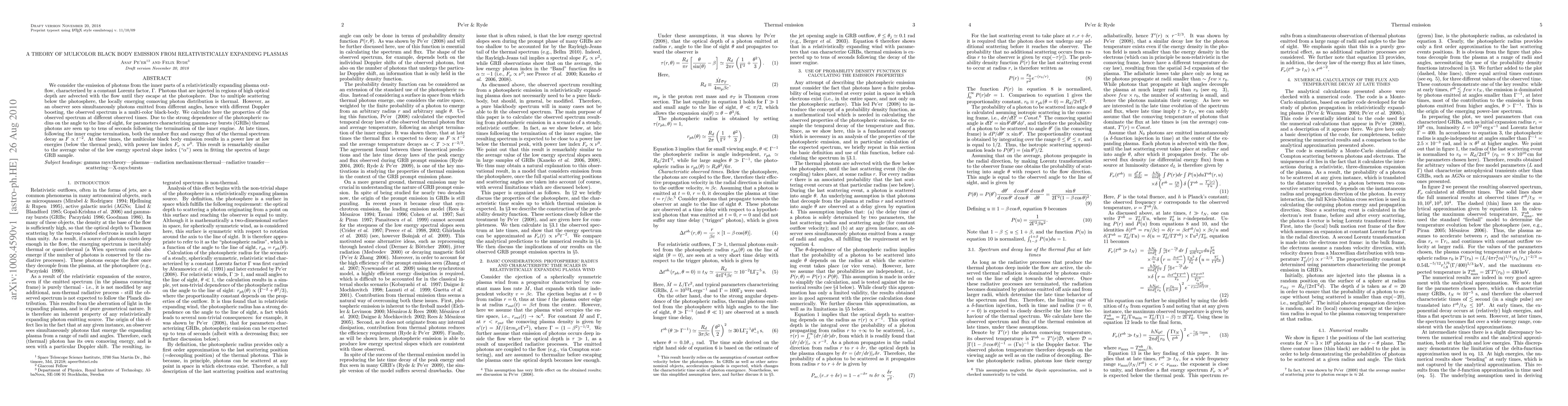 We consider the emission of photons from the inner parts of a relativistically expanding plasma outflow, characterized by a constant Lorentz factor, Gamma. Photons that are injected in regions of high optical depth are advected with the flow until they escape at the photosphere. Due to multiple scattering below the photosphere, the locally emerging comoving photon distribution is thermal. However, as an observer sees simultaneously photons emitted from different angles, hence with different Doppler boosting, the observed spectrum is a multi-color black-body. We calculate here the properties of the observed spectrum at different observed times. Due to the strong dependence of the photospheric radius on the angle to the line of sight, for parameters characterizing gamma-ray bursts (GRBs) thermal photons are seen up to tens of seconds following the termination of the inner engine. At late times, following the inner engine termination, both the number flux and energy flux of the thermal spectrum decay as F ~ t^{-2}. At these times, the multicolor black body emission results in a power law at low energies (below the thermal peak), with power law index F_\nu ~ \nu^{0}. This result is remarkably similar to the average value of the low energy spectral slope index (``\alpha'') seen in fitting the spectra of large GRB sample.