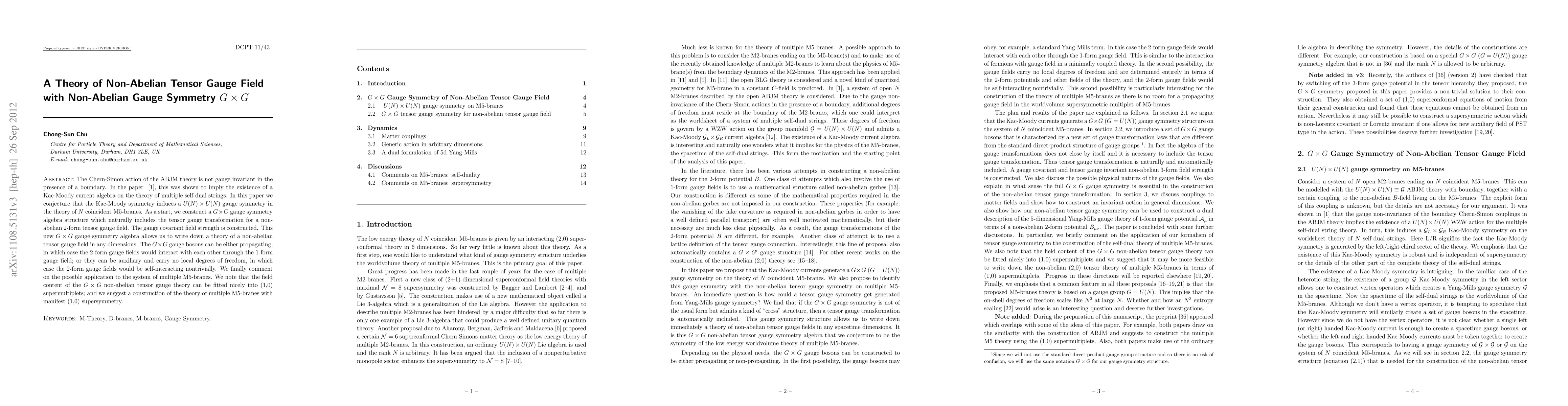 The Chern-Simon action of the ABJM theory is not gauge invariant in the presence of a boundary. In the paper arXiv:0909.2333, this was shown to imply the existence of a Kac-Moody symmetry on the theory of multiple self-dual strings. In this paper we conjecture that the Kac-Moody symmetry induces a U(N)x U(N) gauge symmetry in the theory of N coincident M5-branes. As a start, we construct this G x G gauge symmetry algebra structure which naturally includes the tensor gauge transformation for a non-abelian 2-form tensor gauge field. This new G x G gauge structure allows us to write down a theory of a non-abelian tensor gauge field readily. For application to multiple M5-branes, we note that the field content of the G x G non-abelian tensor gauge theory can be fitted nicely as (1,0) supermultiplets; and we suggest a construction of the theory of multiple M5-branes with manifest (1,0) supersymmetry.