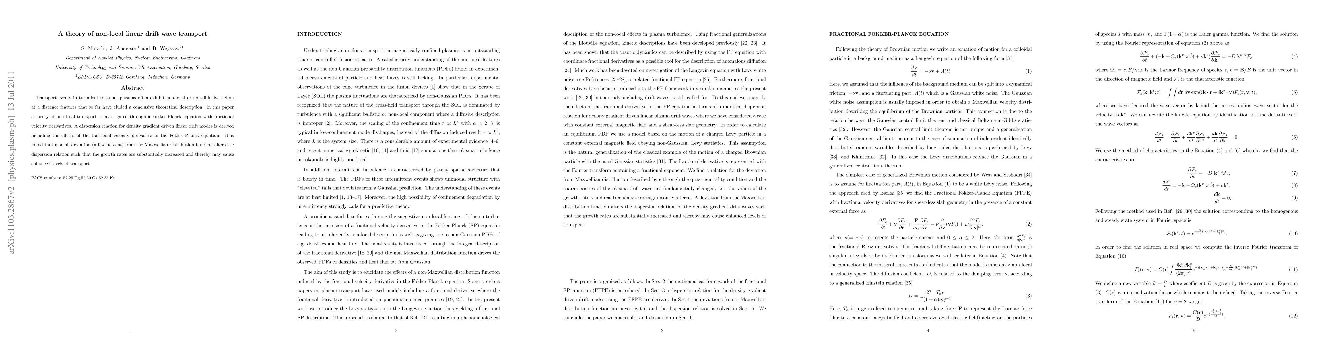 This paper develops a theory for non-local linear drift wave transport in turbulent tokamak plasmas using a Fokker-Planck equation with fractional velocity derivatives. The theory shows that slight deviations from the Maxwellian distribution function can significantly increase growth rates and enhance transport levels.