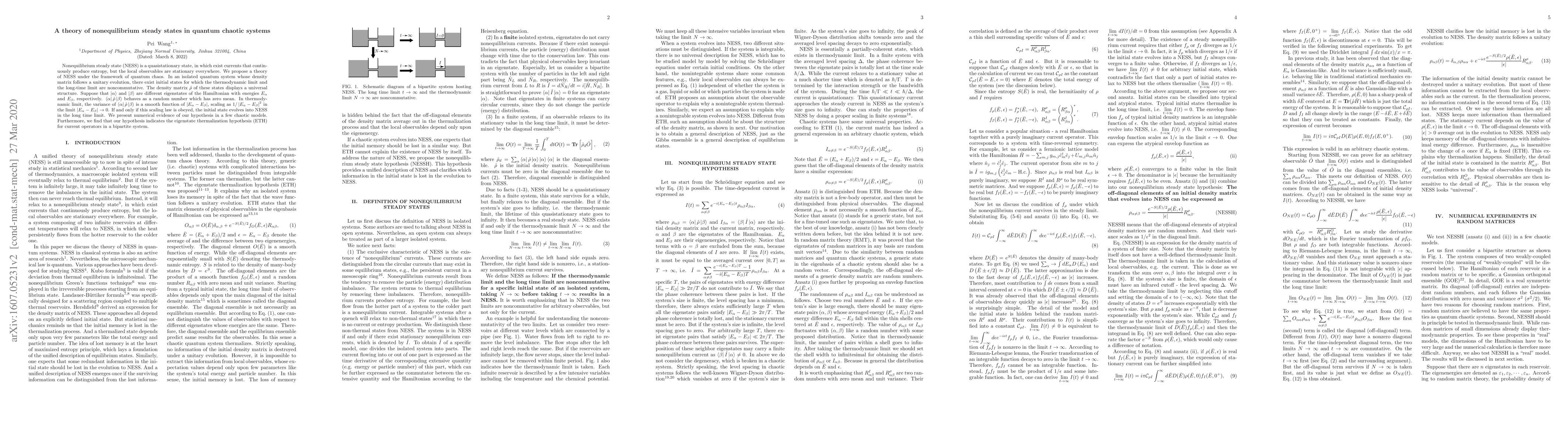 Nonequilibrium steady state (NESS) is a quasistationary state, in which exist currents that continuously produce entropy, but the local observables are stationary everywhere. We propose a theory of NESS under the framework of quantum chaos. In an isolated quantum system, there exist some initial states for which the thermodynamic limit and the long-time limit are noncommutative. The density matrix $\hat \rho$ of these states displays a universal structure. Suppose that $\alpha$ and $\beta$ are different eigenstates of the Hamiltonian with energies $E_\alpha$ and $E_\beta$, respectively. $<\alpha|\hat \rho|\beta>$ behaves as a random number which approximately follows the Laplace distribution with zero mean. In thermodynamic limit, the variance of $<\alpha|\hat \rho|\beta>$ is a smooth function of $\left|E_\alpha-E_\beta\right|$, scaling as $1/(E_\alpha-E_\beta)^2$ in the limit $\left|E_\alpha-E_\beta\right|\to 0$. If and only if this scaling law is obeyed, the initial state evolves into NESS in the long time limit. We present numerical evidence of our hypothesis in a few chaotic models. Furthermore, we find that our hypothesis implies the eigenstate thermalization hypothesis (ETH) in a bipartite system.