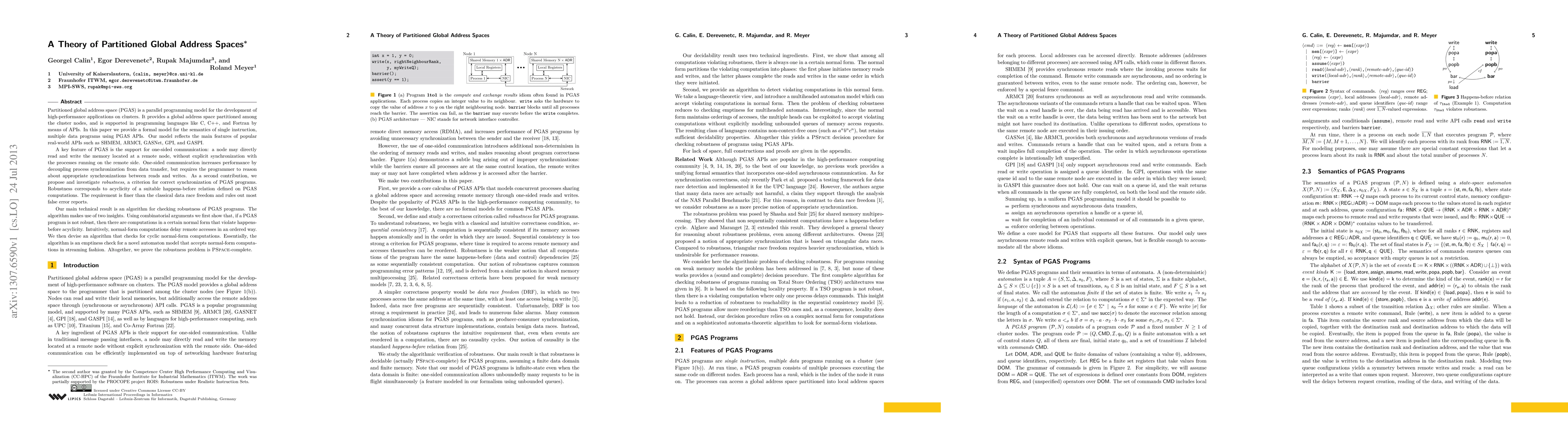 Partitioned global address space (PGAS) is a parallel programming model for the development of applications on clusters. It provides a global address space partitioned among the cluster nodes, and is supported in programming languages like C, C++, and Fortran by means of APIs. In this paper we provide a formal model for the semantics of single instruction, multiple data programs using PGAS APIs. Our model reflects the main features of popular real-world APIs such as SHMEM, ARMCI, GASNet, GPI, and GASPI. A key feature of PGAS is the support for one-sided communication: a node may directly read and write the memory located at a remote node, without explicit synchronization with the processes running on the remote side. One-sided communication increases performance by decoupling process synchronization from data transfer, but requires the programmer to reason about appropriate synchronizations between reads and writes. As a second contribution, we propose and investigate robustness, a criterion for correct synchronization of PGAS programs. Robustness corresponds to acyclicity of a suitable happens-before relation defined on PGAS computations. The requirement is finer than the classical data race freedom and rules out most false error reports. Our main result is an algorithm for checking robustness of PGAS programs. The algorithm makes use of two insights. Using combinatorial arguments we first show that, if a PGAS program is not robust, then there are computations in a certain normal form that violate happens-before acyclicity. Intuitively, normal-form computations delay remote accesses in an ordered way. We then devise an algorithm that checks for cyclic normal-form computations. Essentially, the algorithm is an emptiness check for a novel automaton model that accepts normal-form computations in streaming fashion. Altogether, we prove the robustness problem is PSpace-complete.