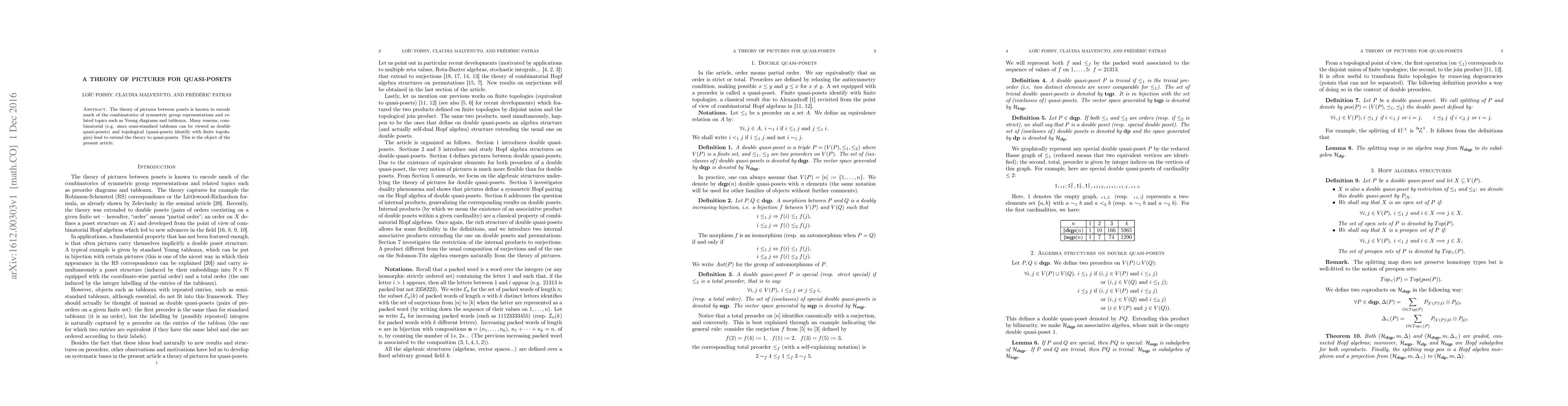 The theory of pictures between posets is known to encode much of the combinatorics of symmetric group representations and related topics such as Young diagrams and tableaux. Many reasons, com-binatorial (e.g. since semi-standard tableaux can be viewed as double quasi-posets) and topological (quasi-posets identify with finite topolo-gies) lead to extend the theory to quasi-posets. This is the object of the present article.