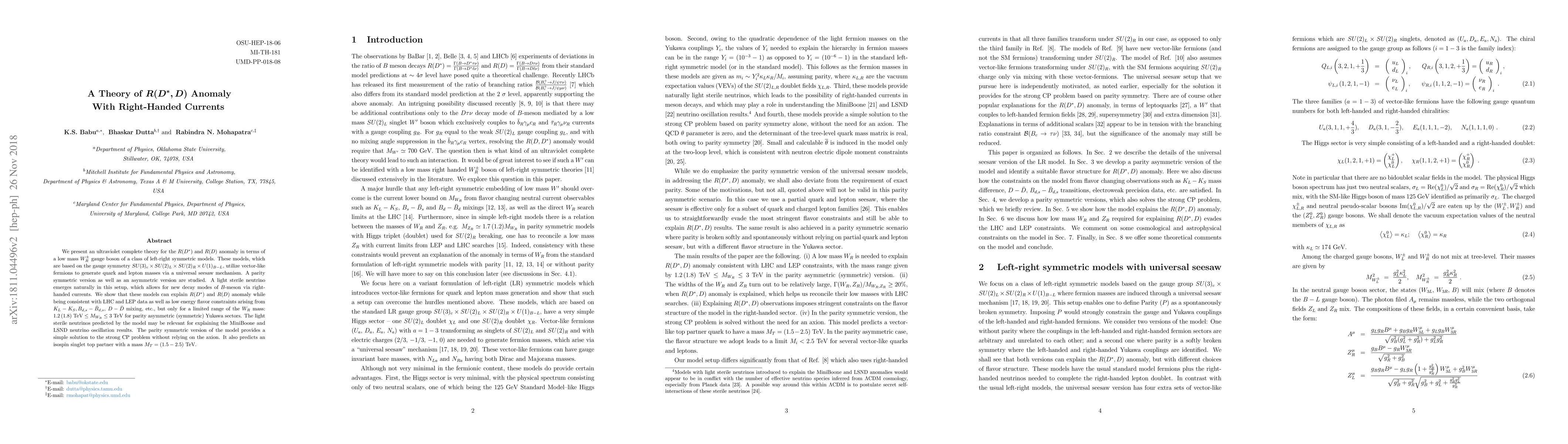 We present an ultraviolet complete theory for the $R(D^*)$ and $R(D)$ anomaly in terms of a low mass $W_R^\pm$ gauge boson of a class of left-right symmetric models. These models, which are based on the gauge symmetry $SU(3)_c \times SU(2)_L \times SU(2)_R \times U(1)_{B-L}$, utilize vector-like fermions to generate quark and lepton masses via a universal seesaw mechanism. A parity symmetric version as well as an asymmetric version are studied. A light sterile neutrino emerges naturally in this setup, which allows for new decay modes of $B$-meson via right-handed currents. We show that these models can explain $R(D^*)$ and $R(D)$ anomaly while being consistent with LHC and LEP data as well as low energy flavor constraints arising from $K_L-K_S, B_{d,s}-\bar{B}_{d,s}$, $D-\bar{D}$ mixing, etc., but only for a limited range of the $W_R$ mass: $1.2\, (1.8)~{\rm TeV} \leq M_{W_R}\leq 3~ {\rm TeV}$ for parity asymmetric (symmetric) Yukawa sectors. The light sterile neutrinos predicted by the model may be relevant for explaining the MiniBoone and LSND neutrino oscillation results. The parity symmetric version of the model provides a simple solution to the strong CP problem without relying on the axion. It also predicts an isospin singlet top partner with a mass $M_T = (1.5-2.5)$ TeV.