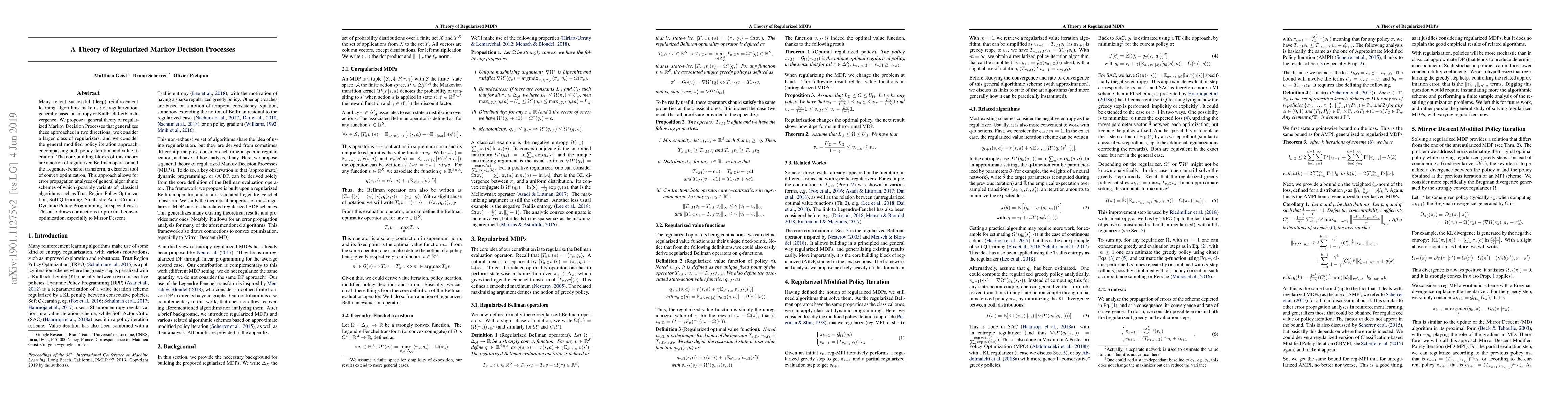 Many recent successful (deep) reinforcement learning algorithms make use of regularization, generally based on entropy or Kullback-Leibler divergence. We propose a general theory of regularized Markov Decision Processes that generalizes these approaches in two directions: we consider a larger class of regularizers, and we consider the general modified policy iteration approach, encompassing both policy iteration and value iteration. The core building blocks of this theory are a notion of regularized Bellman operator and the Legendre-Fenchel transform, a classical tool of convex optimization. This approach allows for error propagation analyses of general algorithmic schemes of which (possibly variants of) classical algorithms such as Trust Region Policy Optimization, Soft Q-learning, Stochastic Actor Critic or Dynamic Policy Programming are special cases. This also draws connections to proximal convex optimization, especially to Mirror Descent.
