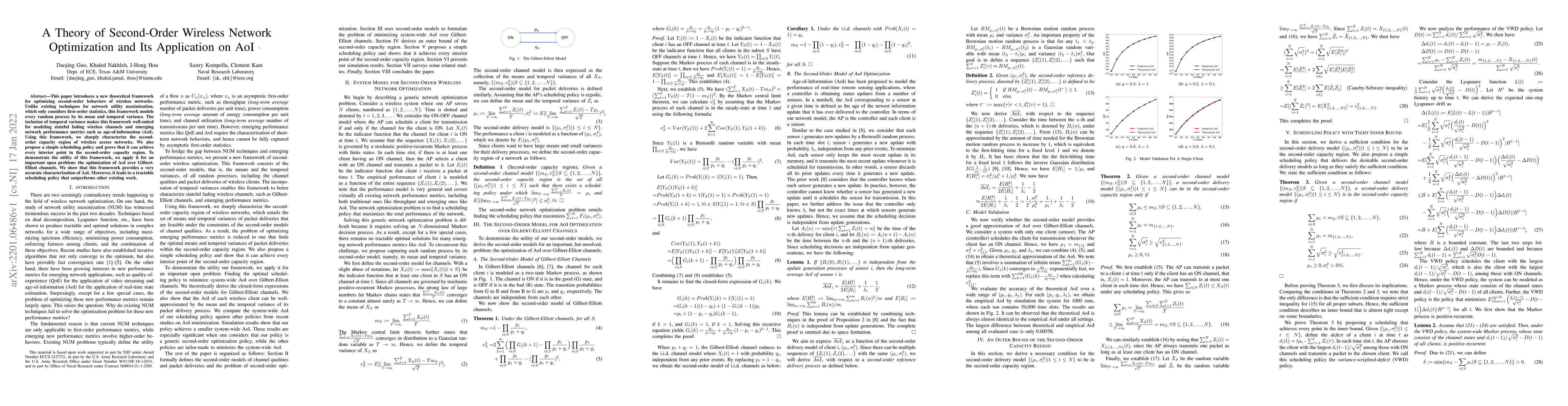 This paper introduces a new theoretical framework for optimizing second-order behaviors of wireless networks. Unlike existing techniques for network utility maximization, which only considers first-order statistics, this framework models every random process by its mean and temporal variance. The inclusion of temporal variance makes this framework well-suited for modeling stateful fading wireless channels and emerging network performance metrics such as age-of-information (AoI). Using this framework, we sharply characterize the second-order capacity region of wireless access networks. We also propose a simple scheduling policy and prove that it can achieve every interior point in the second-order capacity region. To demonstrate the utility of this framework, we apply it for an important open problem: the optimization of AoI over Gilbert-Elliott channels. We show that this framework provides a very accurate characterization of AoI. Moreover, it leads to a tractable scheduling policy that outperforms other existing work.