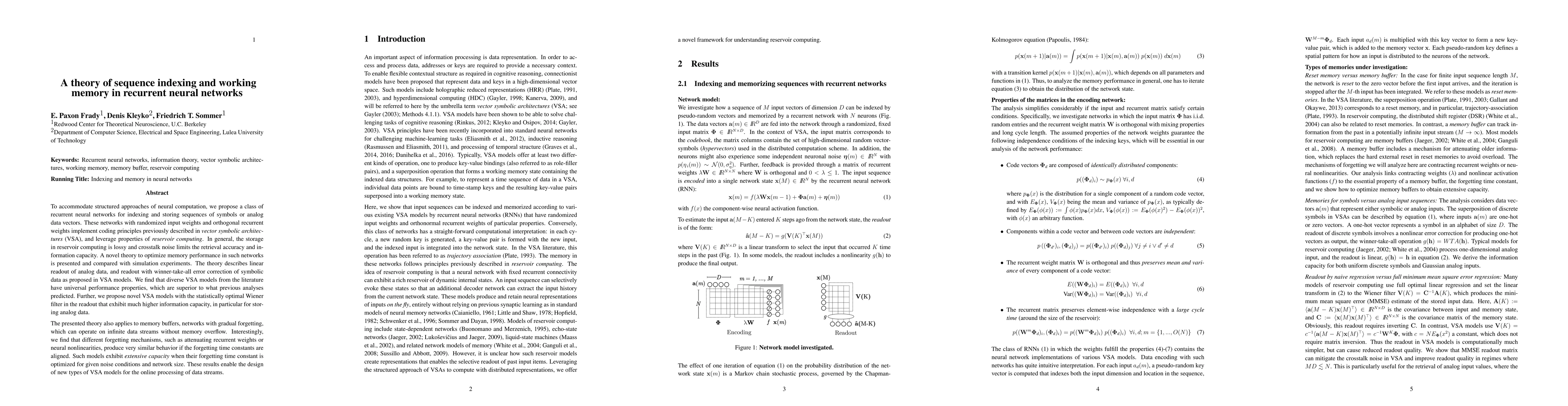 To accommodate structured approaches of neural computation, we propose a class of recurrent neural networks for indexing and storing sequences of symbols or analog data vectors. These networks with randomized input weights and orthogonal recurrent weights implement coding principles previously described in vector symbolic architectures (VSA), and leverage properties of reservoir computing. In general, the storage in reservoir computing is lossy and crosstalk noise limits the retrieval accuracy and information capacity. A novel theory to optimize memory performance in such networks is presented and compared with simulation experiments. The theory describes linear readout of analog data, and readout with winner-take-all error correction of symbolic data as proposed in VSA models. We find that diverse VSA models from the literature have universal performance properties, which are superior to what previous analyses predicted. Further, we propose novel VSA models with the statistically optimal Wiener filter in the readout that exhibit much higher information capacity, in particular for storing analog data. The presented theory also applies to memory buffers, networks with gradual forgetting, which can operate on infinite data streams without memory overflow. Interestingly, we find that different forgetting mechanisms, such as attenuating recurrent weights or neural nonlinearities, produce very similar behavior if the forgetting time constants are aligned. Such models exhibit extensive capacity when their forgetting time constant is optimized for given noise conditions and network size. These results enable the design of new types of VSA models for the online processing of data streams.