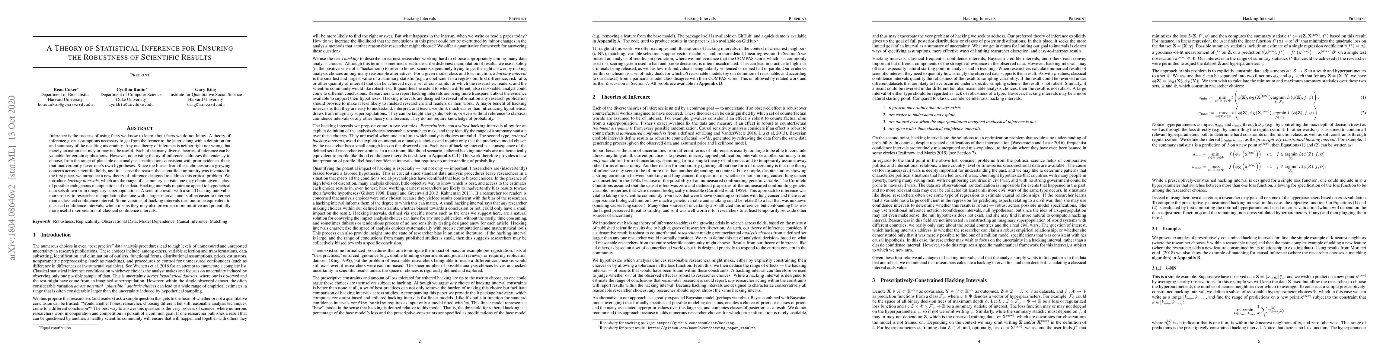 Inference is the process of using facts we know to learn about facts we do not know. A theory of inference gives assumptions necessary to get from the former to the latter, along with a definition for and summary of the resulting uncertainty. Any one theory of inference is neither right nor wrong, but merely an axiom that may or may not be useful. Each of the many diverse theories of inference can be valuable for certain applications. However, no existing theory of inference addresses the tendency to choose, from the range of plausible data analysis specifications consistent with prior evidence, those that inadvertently favor one's own hypotheses. Since the biases from these choices are a growing concern across scientific fields, and in a sense the reason the scientific community was invented in the first place, we introduce a new theory of inference designed to address this critical problem. We introduce hacking intervals, which are the range of a summary statistic one may obtain given a class of possible endogenous manipulations of the data. Hacking intervals require no appeal to hypothetical data sets drawn from imaginary superpopulations. A scientific result with a small hacking interval is more robust to researcher manipulation than one with a larger interval, and is often easier to interpret than a classical confidence interval. Some versions of hacking intervals turn out to be equivalent to classical confidence intervals, which means they may also provide a more intuitive and potentially more useful interpretation of classical confidence intervals.