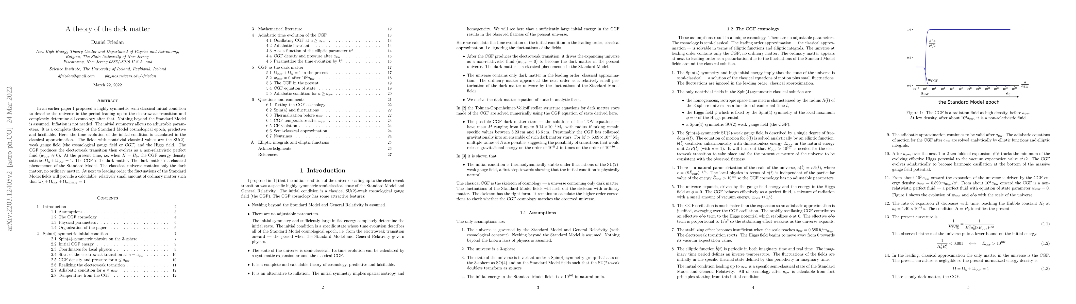 In an earlier paper I proposed a highly symmetric semi-classical initial condition to describe the universe in the period leading up to the electroweak transition and completely determine all cosmology after that. Nothing beyond the Standard Model is assumed. Inflation is not needed. The initial symmetry allows no adjustable parameters. It is a complete theory of the Standard Model cosmological epoch, predictive and falsifiable. Here, the time evolution of the initial condition is calculated in the classical approximation. The fields with nontrivial classical values are the SU(2)-weak gauge field (the cosmological gauge field or CGF) and the Higgs field. The CGF produces the electroweak transition then evolves as a non-relativistic perfect fluid ($w_{\mathrm{CGF}}\approx 0$). At the present time, i.e. when $H=H_{0}$, the CGF energy density satisfies $\Omega_{\Lambda}+\Omega_{\mathrm{CGF}}=1$. The CGF is the dark matter. The dark matter is a classical phenomenon of the Standard Model. The classsical universe contains only the dark matter, no ordinary matter. At next to leading order the fluctuations of the Standard Model fields will provide a calculable, relatively small amount of ordinary matter such that $\Omega_{\Lambda}+\Omega_{\mathrm{CGF}}+\Omega_{\mathrm{ordinary}}=1$.