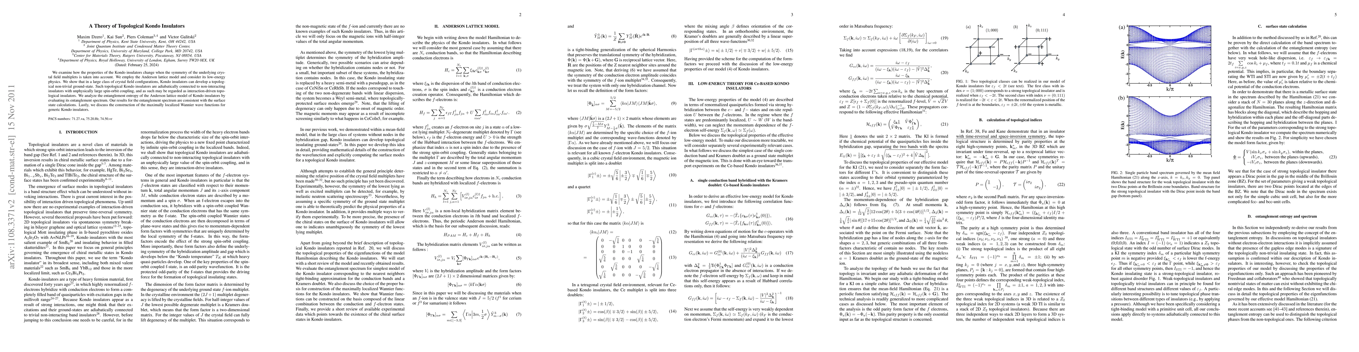 We examine how the properties of the Kondo insulators change when the symmetry of the underlying crystal field multiplets is taken into account. We employ the Anderson lattice model and consider its low-energy physics. We show that in a large class of crystal field configurations, Kondo insulators can develop a topological non-trivial ground-state. Such topological Kondo insulators are adiabatically connected to non-interacting insulators with unphysically large spin-orbit coupling, and as such may be regarded as interaction-driven topological insulators. We analyze the entanglement entropy of the Anderson lattice model of Kondo insulators by evaluating its entanglement spectrum. Our results for the entanglement spectrum are consistent with the surface state calculations. Lastly, we discuss the construction of the maximally localized Wannier wave functions for generic Kondo insulators.