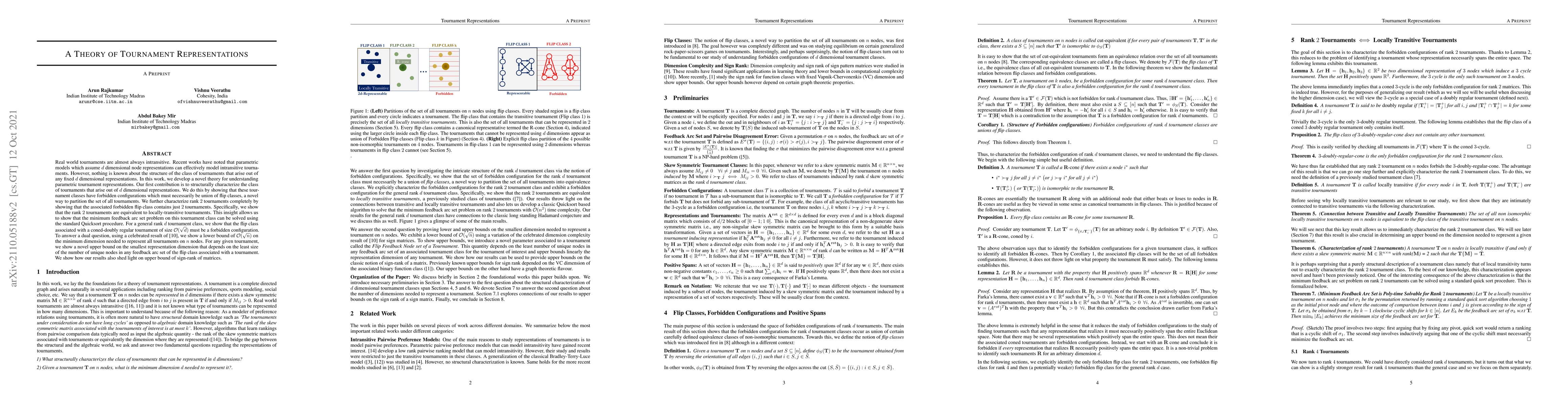 The paper develops a theory for understanding parametric tournament representations, showing that tournaments with d-dimensional node representations have specific forbidden configurations and implications for solving minimum feedback arc set problems.