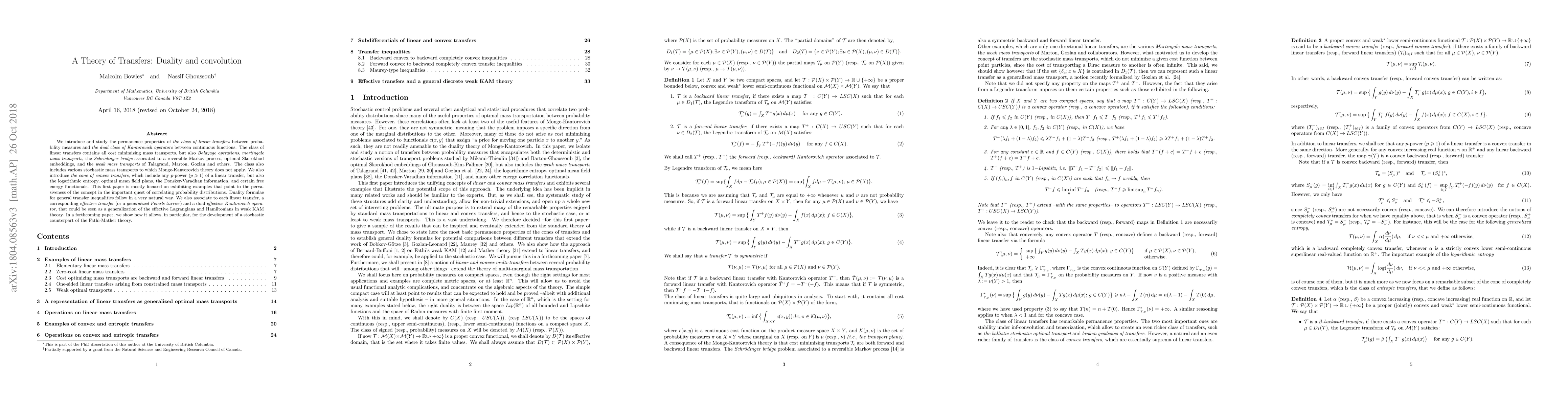 This paper introduces a class of linear transfers between probability measures, encompassing cost-minimizing, martingale, and stochastic mass transports. It explores the duality and convolution properties of these transfers, highlighting their significance in correlating probability distributions and proposing generalized weak KAM solutions for stochastic systems.