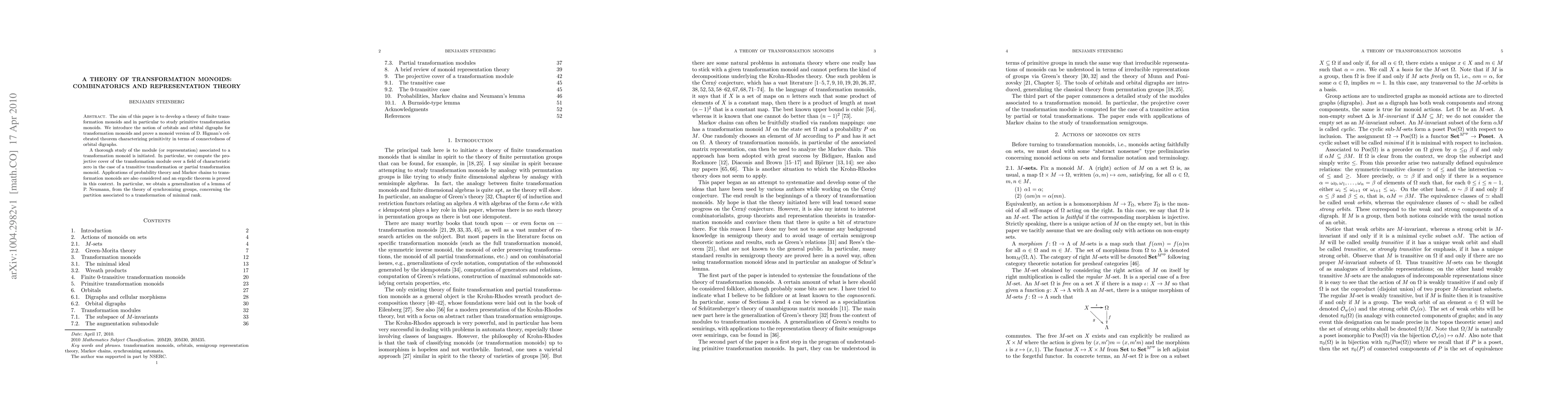 This paper develops a theory of finite transformation monoids, focusing on primitive ones, introducing orbitals and proving a Higman's theorem variant for primitivity. It initiates the study of transformation monoid representations, computes projective covers, and applies probability theory and Markov chains to derive an ergodic theorem.