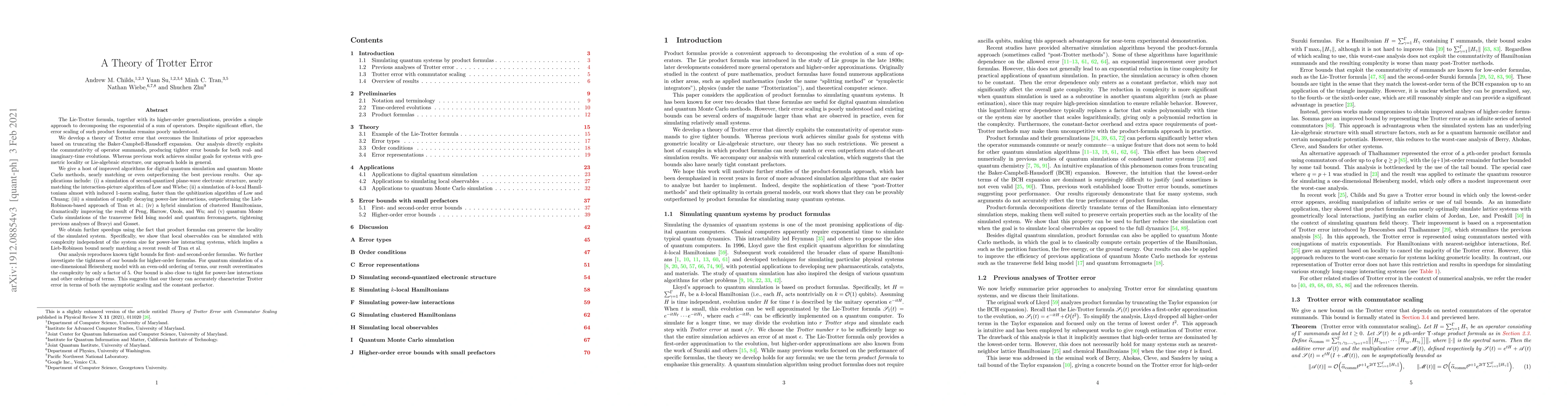 The paper presents a general theory of Trotter error, improved algorithms for quantum simulation and Monte Carlo methods, and a method to derive Lieb-Robinson bounds for power-law Hamiltonians, all with tighter error bounds compared to previous approaches.