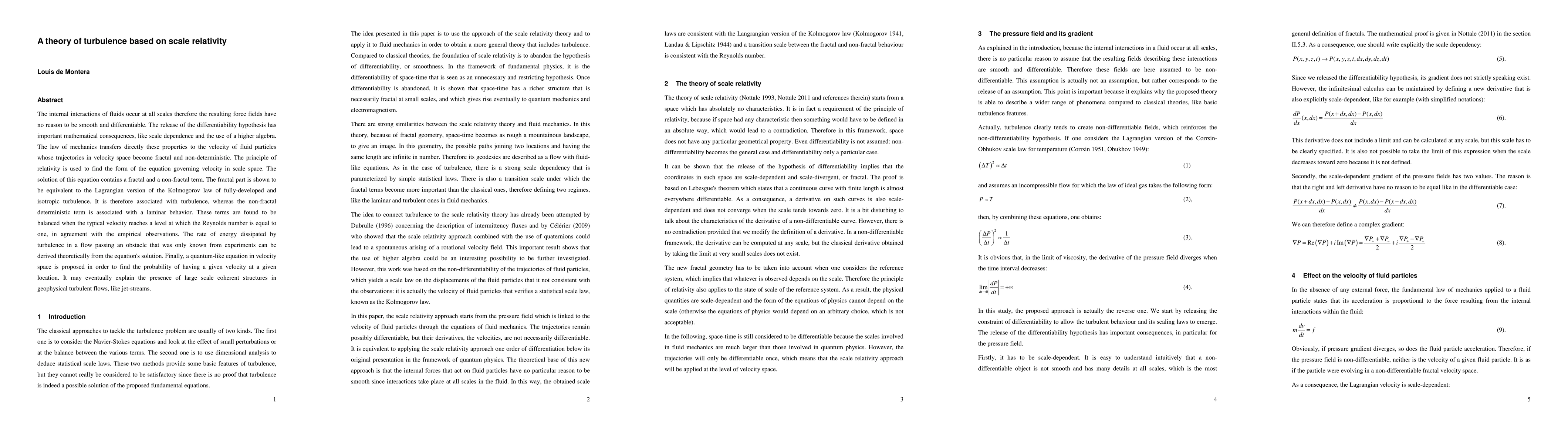 The internal interactions of fluids occur at all scales therefore the resulting force fields have no reason to be smooth and differentiable. The release of the differentiability hypothesis has important mathematical consequences, like scale dependence and the use of a higher algebra. The law of mechanics transfers directly these properties to the velocity of fluid particles whose trajectories in velocity space become fractal and non-deterministic. The principle of relativity is used to find the form of the equation governing velocity in scale space. The solution of this equation contains a fractal and a non-fractal term. The fractal part is shown to be equivalent to the Lagrangian version of the Kolmogorov law of fully-developed and isotropic turbulence. It is therefore associated with turbulence, whereas the non-fractal deterministic term is associated with a laminar behavior. These terms are found to be balanced when the typical velocity reaches a level at which the Reynolds number is equal to one, in agreement with the empirical observations. The rate of energy dissipated by turbulence in a flow passing an obstacle that was only known from experiments can be derived theoretically from the equation's solution. Finally, a quantum-like equation in velocity space is proposed in order to find the probability of having a given velocity at a given location. It may eventually explain the presence of large scale coherent structures in geophysical turbulent flows, like jet-streams.