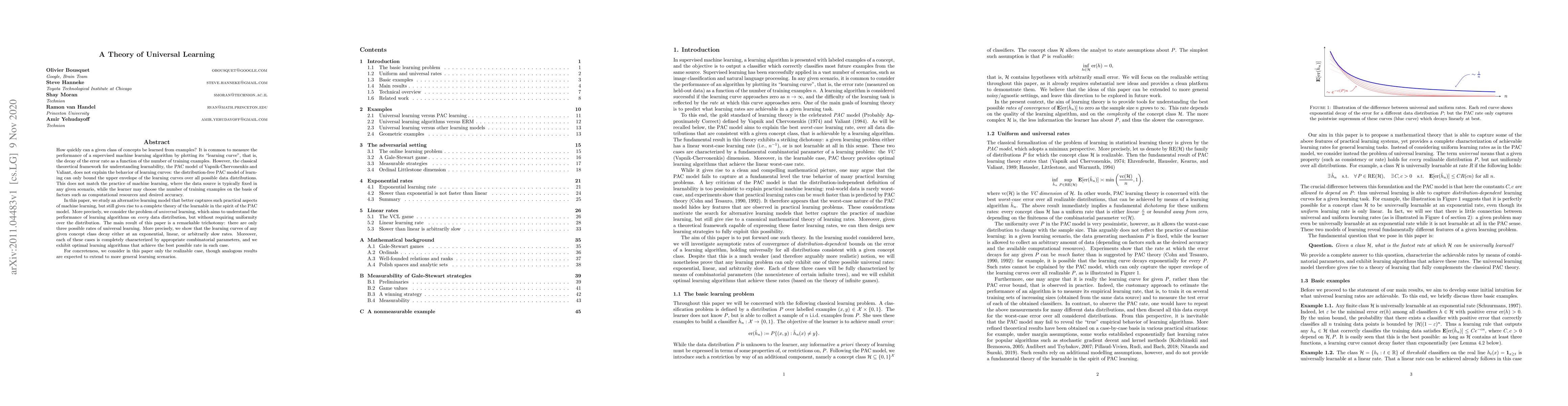 How quickly can a given class of concepts be learned from examples? It is common to measure the performance of a supervised machine learning algorithm by plotting its "learning curve", that is, the decay of the error rate as a function of the number of training examples. However, the classical theoretical framework for understanding learnability, the PAC model of Vapnik-Chervonenkis and Valiant, does not explain the behavior of learning curves: the distribution-free PAC model of learning can only bound the upper envelope of the learning curves over all possible data distributions. This does not match the practice of machine learning, where the data source is typically fixed in any given scenario, while the learner may choose the number of training examples on the basis of factors such as computational resources and desired accuracy. In this paper, we study an alternative learning model that better captures such practical aspects of machine learning, but still gives rise to a complete theory of the learnable in the spirit of the PAC model. More precisely, we consider the problem of universal learning, which aims to understand the performance of learning algorithms on every data distribution, but without requiring uniformity over the distribution. The main result of this paper is a remarkable trichotomy: there are only three possible rates of universal learning. More precisely, we show that the learning curves of any given concept class decay either at an exponential, linear, or arbitrarily slow rates. Moreover, each of these cases is completely characterized by appropriate combinatorial parameters, and we exhibit optimal learning algorithms that achieve the best possible rate in each case. For concreteness, we consider in this paper only the realizable case, though analogous results are expected to extend to more general learning scenarios.