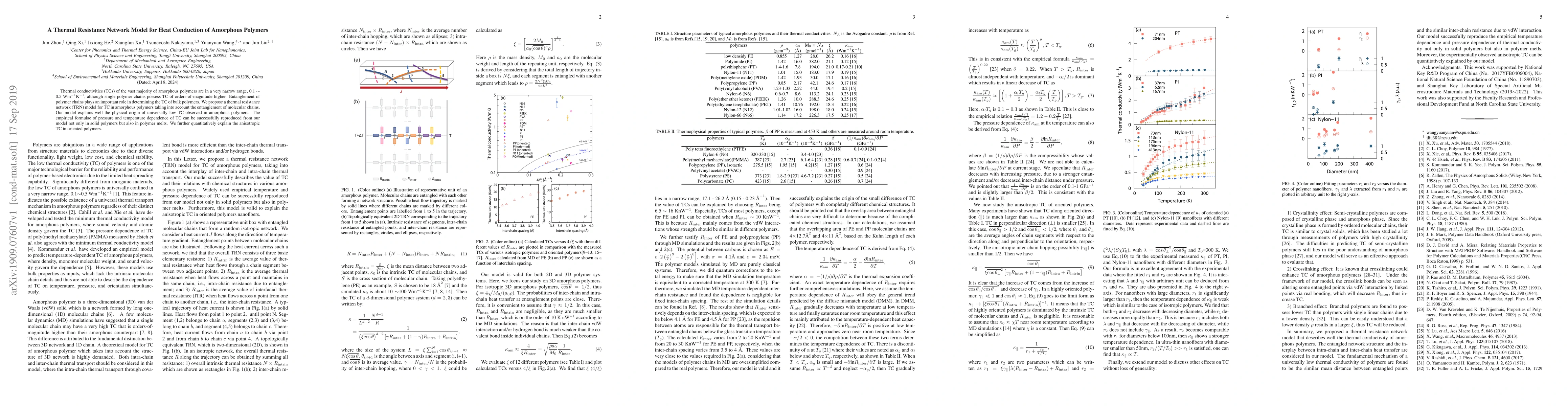 This paper proposes a thermal resistance network model to explain the thermal conductivity of amorphous polymers, attributing the low thermal conductivity to polymer chain entanglement. The model successfully reproduces empirical formulae for pressure and temperature dependence of thermal conductivity in both solid polymers and polymer melts, and explains anisotropic thermal conductivity in oriented polymers.