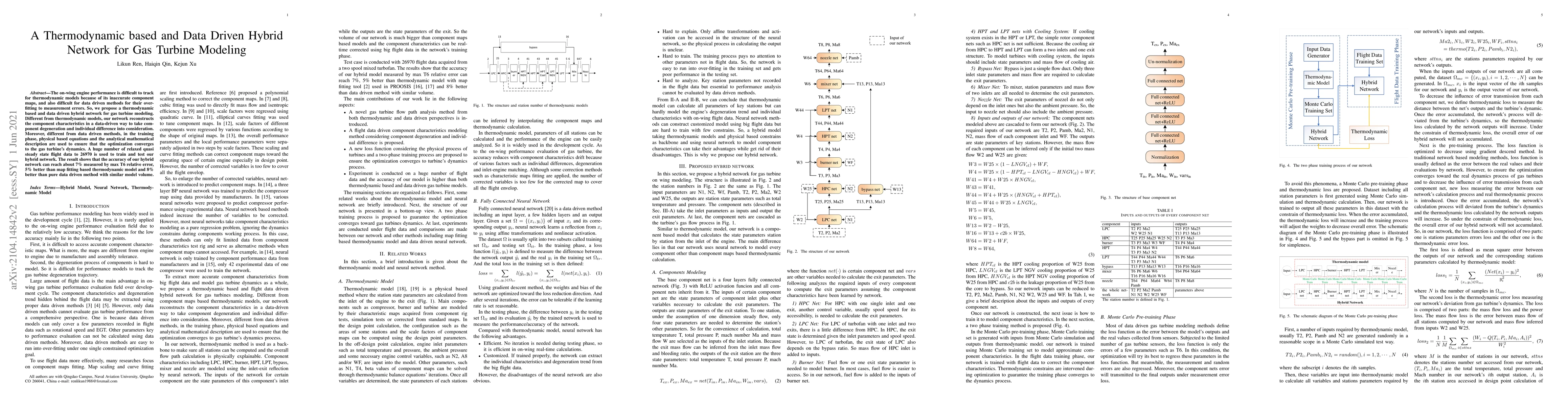 The on-wing engine performance is difficult to track for thermodynamic models because of its inaccurate component maps, and also difficult for data driven methods for their over-fitting to measurement errors. So, we propose a thermodynamic based and data driven hybrid network for gas turbine modeling. Different from thermodynamic models, our network reconstructs the component characteristics in a data-driven way to take component degeneration and individual difference into consideration. Moreover, different from data driven methods, in the training phase, physical based equations and the analytical mathematical description are used to ensure that the optimization converges to the gas turbine's dynamics. A huge number of relaxed quasi steady state flight data to 26970 is used to train and test our hybrid network. The result shows that the accuracy of our hybrid network can reach about 7% measured by max T6 relative error, 5% better than map fitting based thermodynamic model and 8% better than pure data driven method with similar model volume.