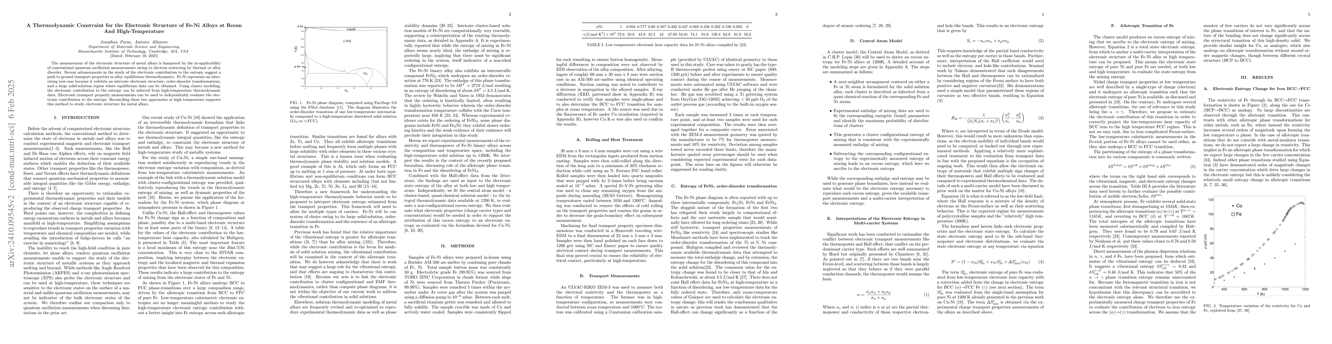 This paper proposes a thermodynamic method to determine the electronic structure of Fe-Ni alloys at high temperatures, overcoming limitations of conventional quantum oscillation measurements. It uses cluster modeling to infer the electronic entropy contribution from thermodynamic data and validates this with transport property measurements, offering a new approach for studying metal alloys.