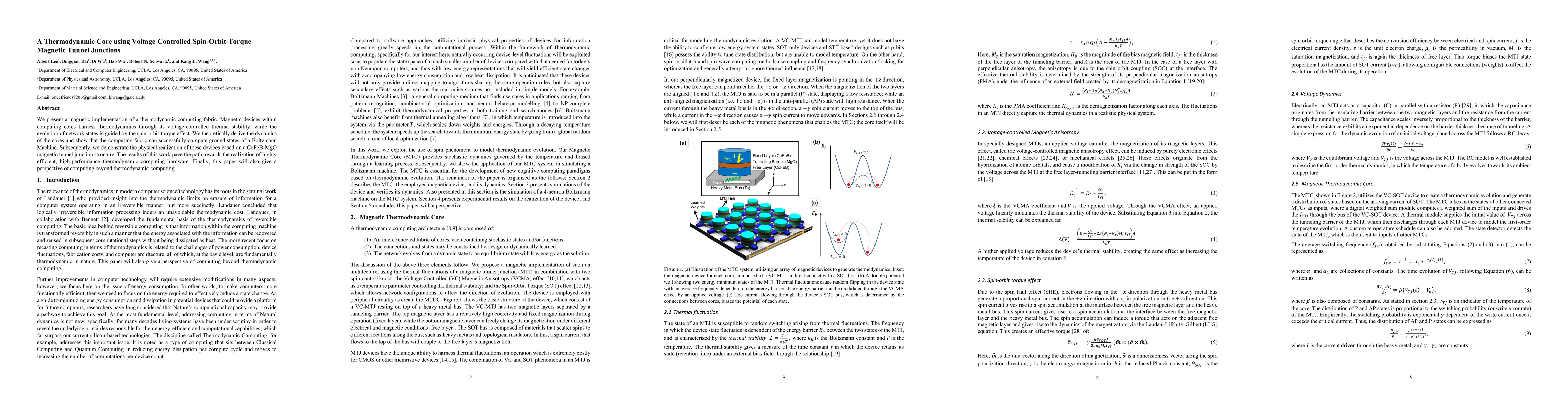 We present a magnetic implementation of a thermodynamic computing fabric. Magnetic devices within computing cores harness thermodynamics through its voltage-controlled thermal stability; while the evolution of network states is guided by the spin-orbit-torque effect. We theoretically derive the dynamics of the cores and show that the computing fabric can successfully compute ground states of a Boltzmann Machine. Subsequently, we demonstrate the physical realization of these devices based on a CoFeB-MgO magnetic tunnel junction structure. The results of this work pave the path towards the realization of highly efficient, high-performance thermodynamic computing hardware. Finally, this paper will also give a perspective of computing beyond thermodynamic computing.