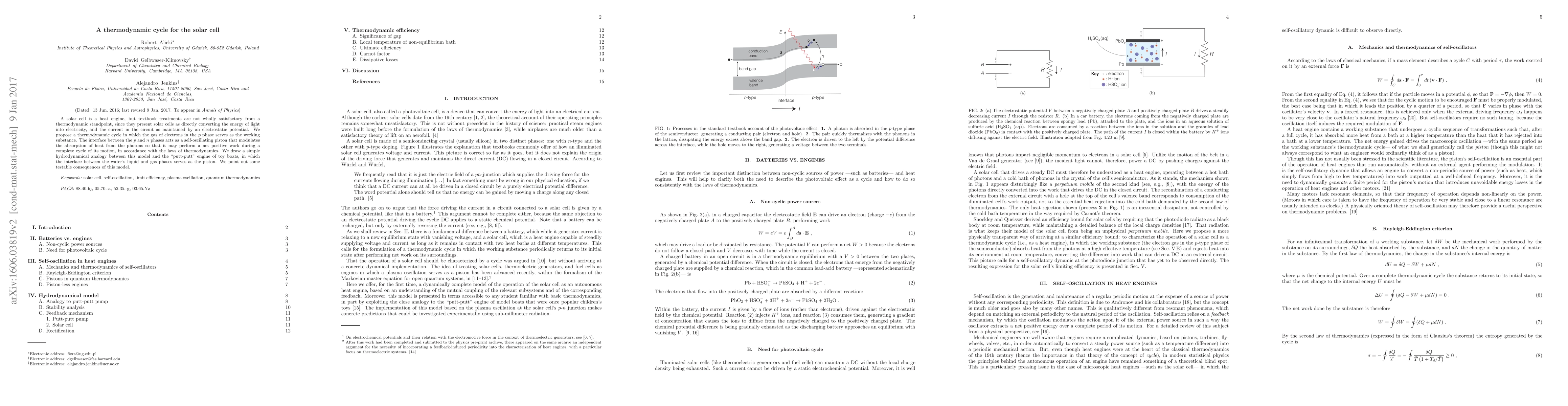 A solar cell is a heat engine, but textbook treatments are not wholly satisfactory from a thermodynamic standpoint, since they present solar cells as directly converting the energy of light into electricity, and the current in the circuit as maintained by an electrostatic potential. We propose a thermodynamic cycle in which the gas of electrons in the p phase serves as the working substance. The interface between the p and n phases acts as a self-oscillating piston that modulates the absorption of heat from the photons so that it may perform a net positive work during a complete cycle of its motion, in accordance with the laws of thermodynamics. We draw a simple hydrodynamical analogy between this model and the "putt-putt"' engine of toy boats, in which the interface between the water's liquid and gas phases serves as the piston. We point out some testable consequences of this model.