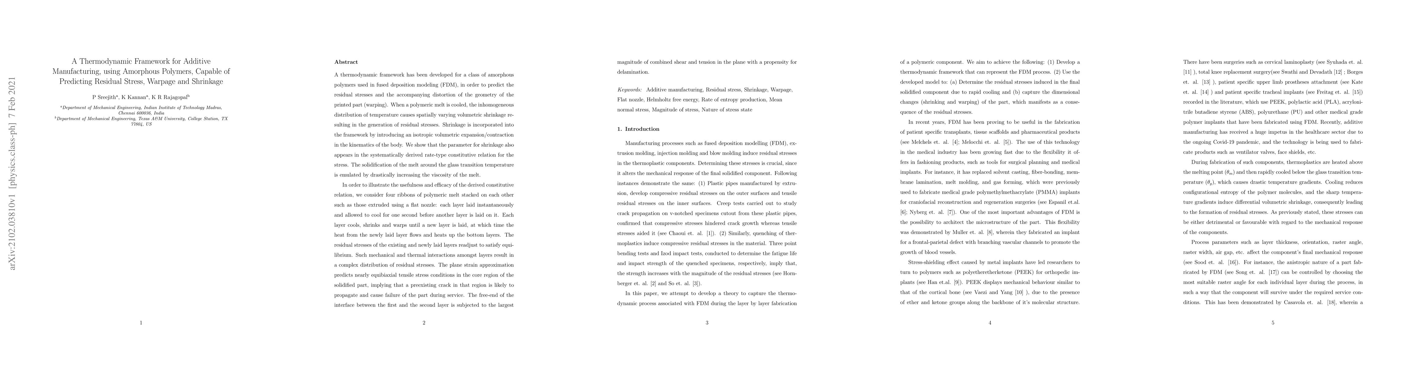 A thermodynamic model predicts residual stresses, warpage, and shrinkage in amorphous polymers used in 3D printing. The model shows complex stress distribution leading to potential part failure and delamination between layers.