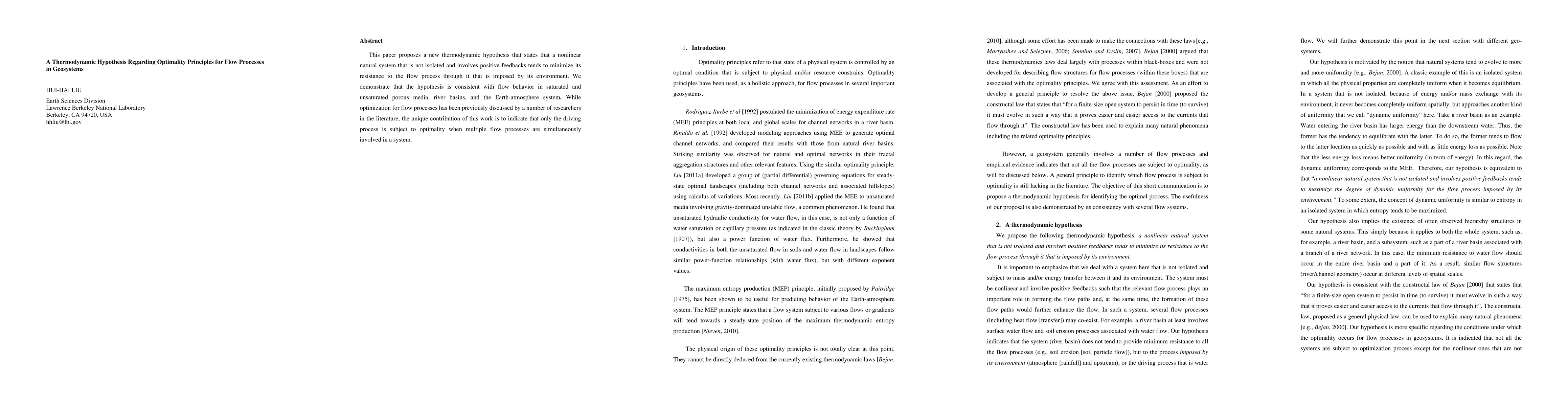 This paper proposes a new thermodynamic hypothesis that states that a nonlinear natural system that is not isolated and involves positive feedbacks tends to minimize its resistance to the flow process through it that is imposed by its environment. We demonstrate that the hypothesis is consistent with flow behavior in saturated and unsaturated porous media, river basins, and the Earth-atmosphere system. While optimization for flow processes has been previously discussed by a number of researchers in the literature, the unique contribution of this work is to indicate that only the driving process is subject to optimality when multiple flow processes are simultaneously involved in a system.