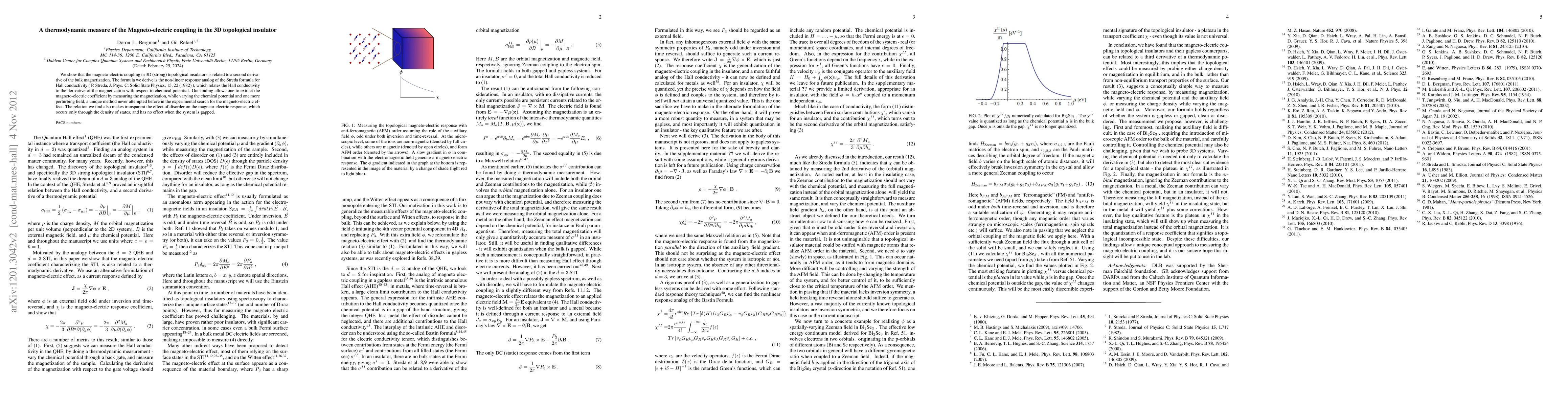 This paper establishes a thermodynamic relationship showing that magneto-electric coupling in 3D topological insulators is linked to the second derivative of the bulk magnetization. The derived formula simplifies experimental measurements of magneto-electric response, offering a method to extract the magneto-electric coefficient by varying magnetization and chemical potential.