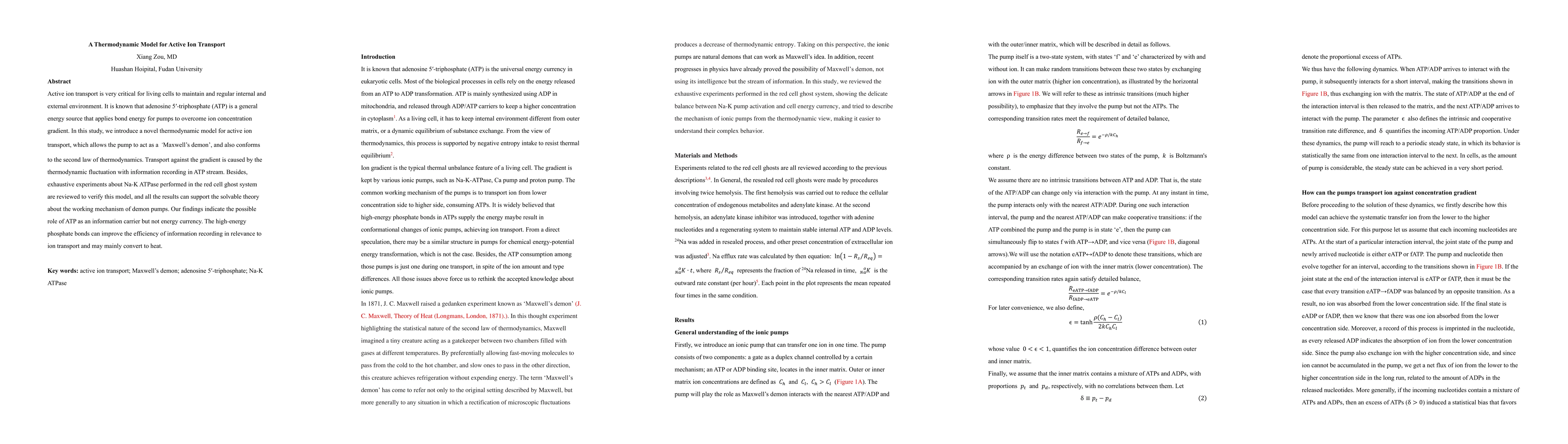 Active ion transport is very critical for living cells to maintain and regular internal and external environment. It is known that adenosine 5'-triphosphate (ATP) is a general energy source that applies bond energy for pumps to overcome ion concentration gradient. In this study, we introduce a novel thermodynamic model for active ion transport, which allows the pump to act as a 'Maxwell's demon', and also conforms to the second law of thermodynamics. Transport against the gradient is caused by the thermodynamic fluctuation with information recording in ATP stream. Besides, exhaustive experiments about Na-K ATPase performed in the red cell ghost system are reviewed to verify this model, and all the results can support the solvable theory about the working mechanism of demon pumps. Our findings indicate the possible role of ATP as an information carrier but not energy currency. The high-energy phosphate bonds can improve the efficiency of information recording in relevance to ion transport and may mainly convert to heat.