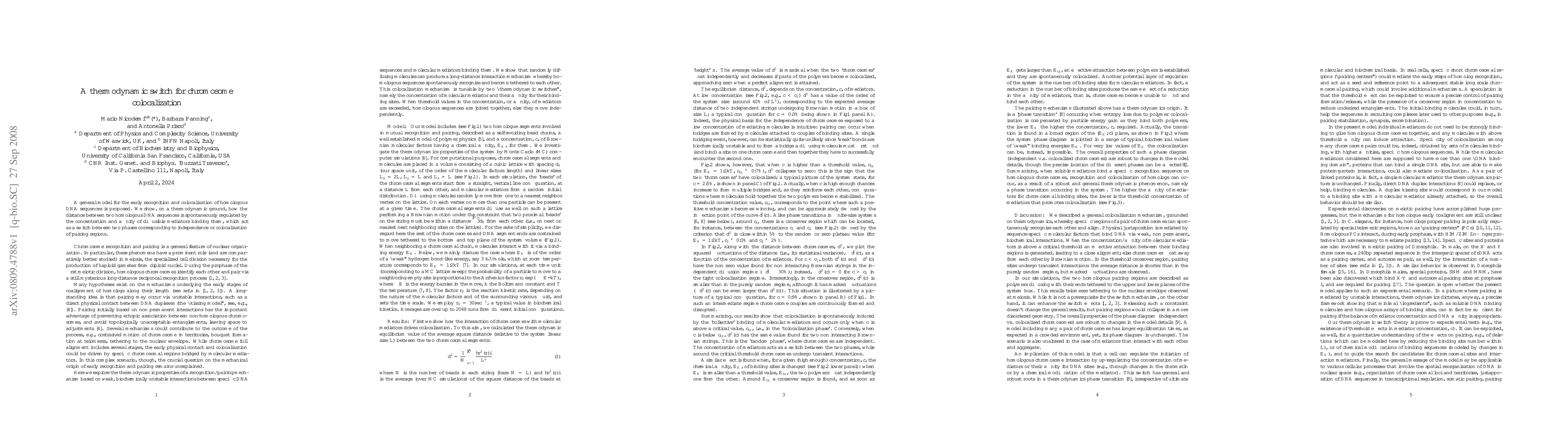 This paper proposes a thermodynamic model explaining how homologous DNA sequences colocalize, with the distance between them regulated by diffusible mediators that act as a switch between independent or colocalized pairing phases. The model highlights the role of mediator concentration and binding affinity in this process.