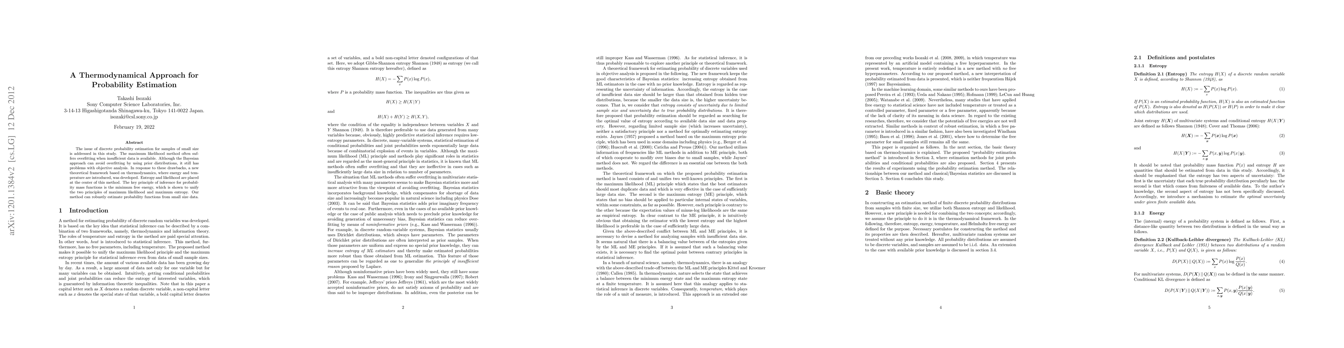 The issue of discrete probability estimation for samples of small size is addressed in this study. The maximum likelihood method often suffers over-fitting when insufficient data is available. Although the Bayesian approach can avoid over-fitting by using prior distributions, it still has problems with objective analysis. In response to these drawbacks, a new theoretical framework based on thermodynamics, where energy and temperature are introduced, was developed. Entropy and likelihood are placed at the center of this method. The key principle of inference for probability mass functions is the minimum free energy, which is shown to unify the two principles of maximum likelihood and maximum entropy. Our method can robustly estimate probability functions from small size data.