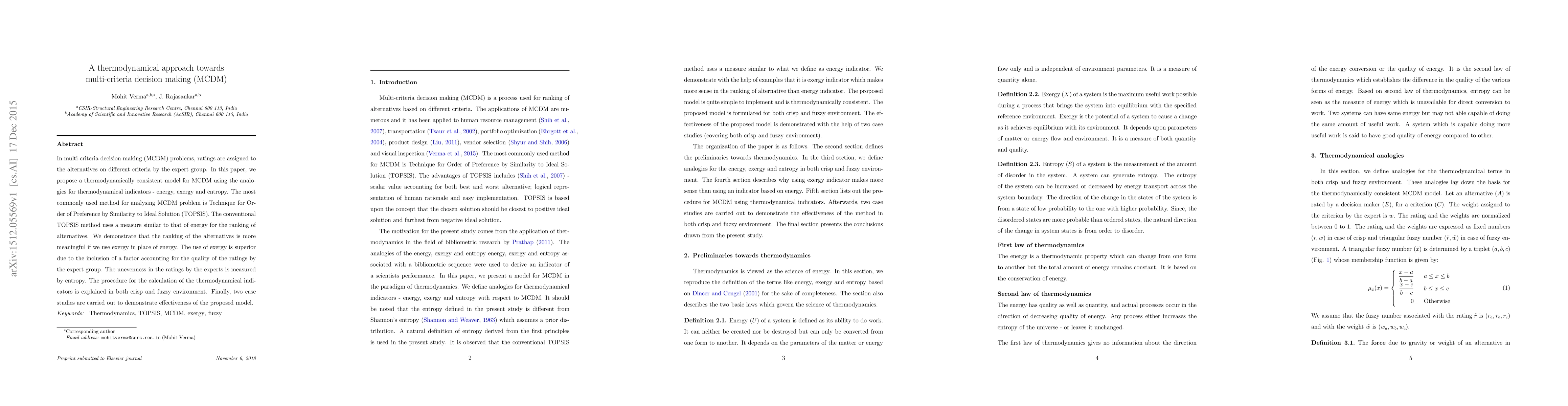 This paper proposes a thermodynamically consistent model for multi-criteria decision making (MCDM) using thermodynamic indicators like energy, exergy, and entropy. It suggests that using exergy instead of energy for ranking alternatives provides a more meaningful assessment due to its inclusion of a quality factor for expert ratings, while entropy measures the unevenness in expert evaluations.