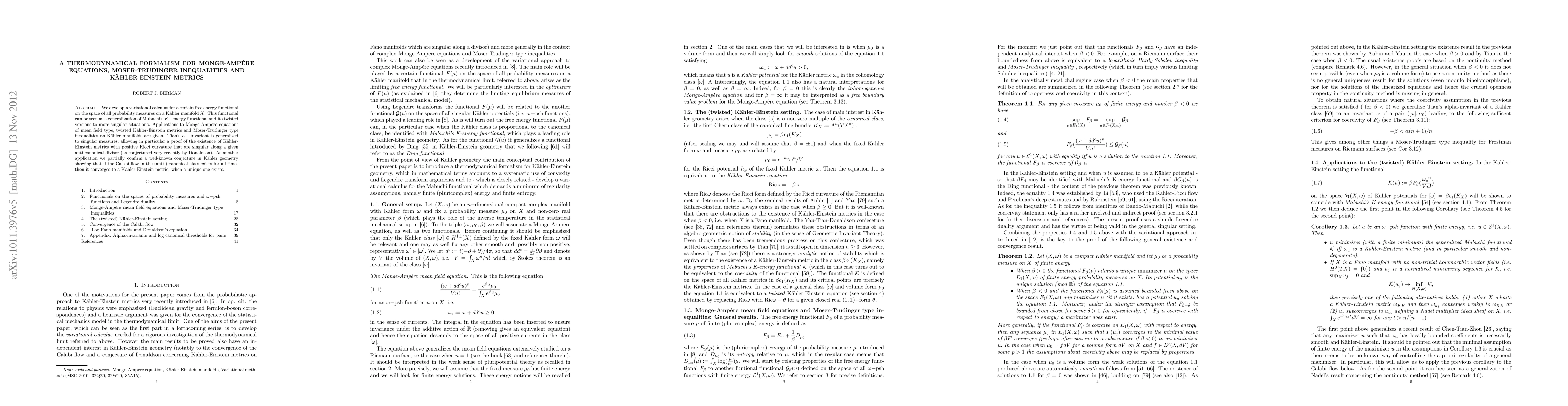 This paper develops a variational calculus for a free energy functional on Kahler manifolds, generalizing Mabuchi's K-energy and its twisted versions. It applies to Monge-Ampere equations, twisted Kahler-Einstein metrics, and Moser-Trudinger inequalities, and extends Tian's alpha-invariant to singular measures, facilitating the construction of singular Kahler-Einstein metrics.
