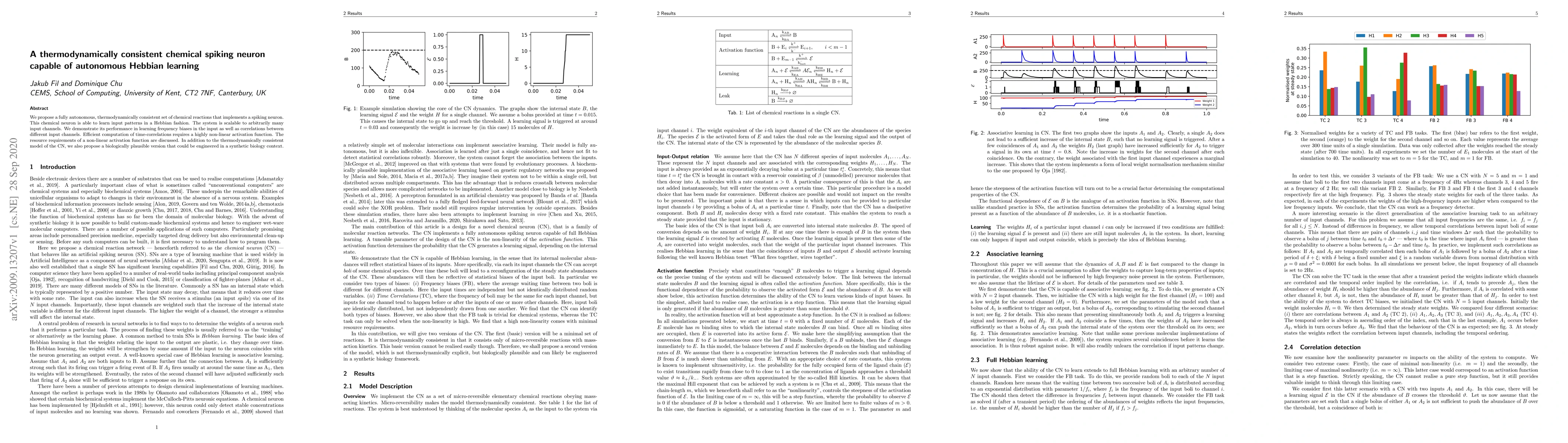 We propose a fully autonomous, thermodynamically consistent set of chemical reactions that implements a spiking neuron. This chemical neuron is able to learn input patterns in a Hebbian fashion. The system is scalable to arbitrarily many input channels. We demonstrate its performance in learning frequency biases in the input as well as correlations between different input channels. Efficient computation of time-correlations requires a highly non-linear activation function. The resource requirements of a non-linear activation function are discussed. In addition to the thermodynamically consistent model of the CN, we also propose a biologically plausible version that could be engineered in a synthetic biology context.