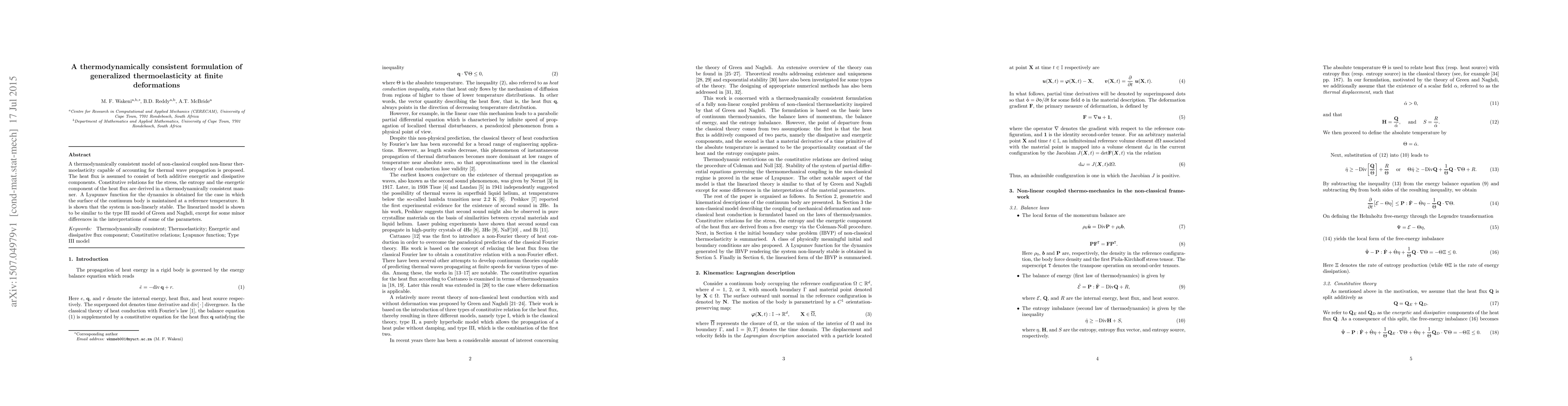 This paper proposes a thermodynamically consistent model for generalized thermoelasticity at finite deformations, incorporating thermal wave propagation and distinguishing between energetic and dissipative heat flux components. The model demonstrates non-linear stability and shares similarities with the type III Green-Naghdi model, albeit with minor parameter interpretation differences.