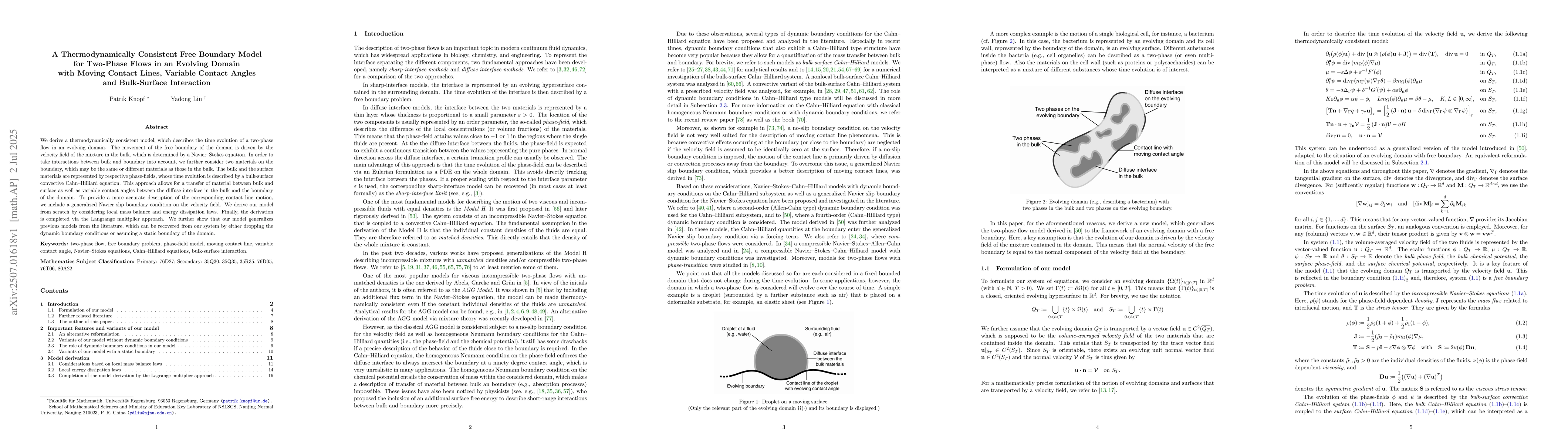 We derive a thermodynamically consistent model, which describes the time evolution of a two-phase flow in an evolving domain. The movement of the free boundary of the domain is driven by the velocity field of the mixture in the bulk, which is determined by a Navier--Stokes equation. In order to take interactions between bulk and boundary into account, we further consider two materials on the boundary, which may be the same or different materials as those in the bulk. The bulk and the surface materials are represented by respective phase-fields, whose time evolution is described by a bulk-surface convective Cahn--Hilliard equation. This approach allows for a transfer of material between bulk and surface as well as variable contact angles between the diffuse interface in the bulk and the boundary of the domain. To provide a more accurate description of the corresponding contact line motion, we include a generalized Navier slip boundary condition on the velocity field. We derive our model from scratch by considering local mass balance and energy dissipation laws. Finally, the derivation is completed via the Langrange multiplier approach. We further show that our model generalizes previous models from the literature, which can be recovered from our system by either dropping the dynamic boundary conditions or assuming a static boundary of the domain.