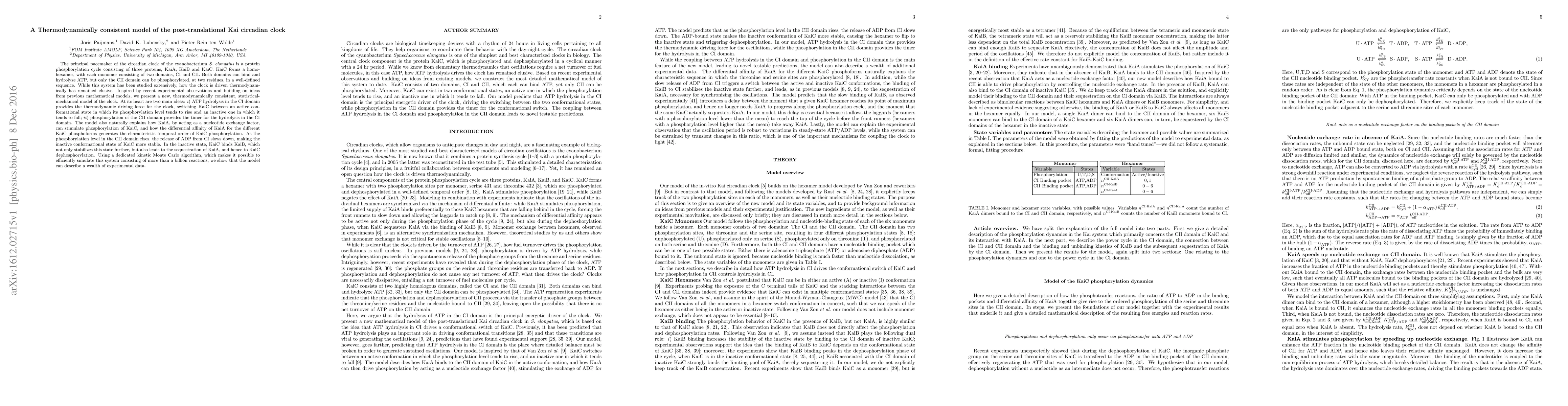 This paper presents a thermodynamically consistent statistical-mechanical model for the circadian clock in the cyanobacterium S. elongatus, driven by ATP hydrolysis in the CI domain of KaiC, which alternates its conformational states. The phosphorylation of the CII domain acts as a timer, and the model explains the role of KaiA and KaiB in regulating the phosphorylation cycle, validated through kinetic Monte Carlo simulations.