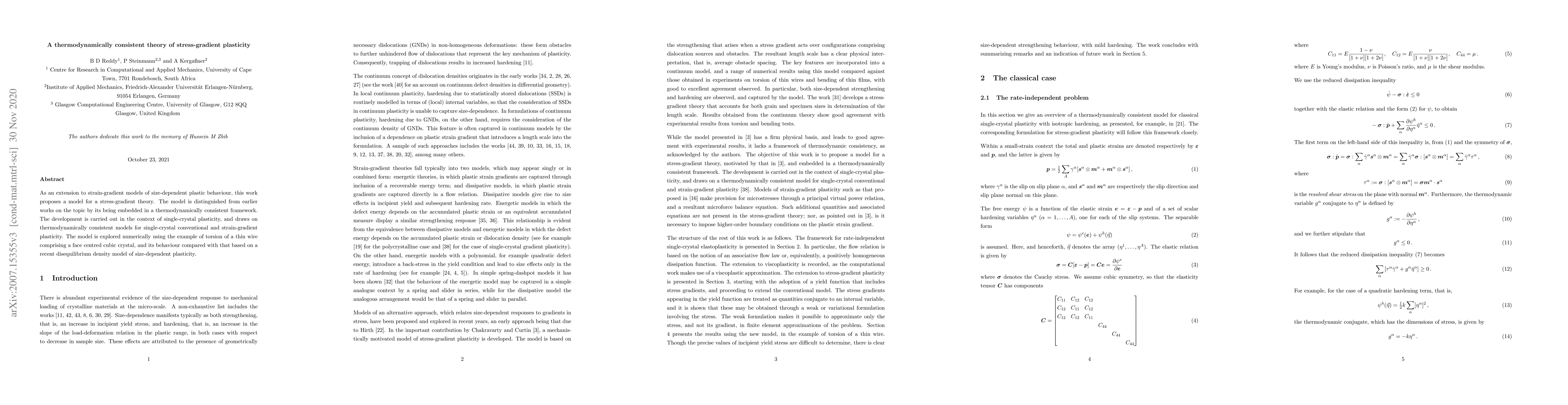 This paper proposes a thermodynamically consistent stress-gradient plasticity model for size-dependent plastic behavior, extending strain-gradient models and validated numerically through torsion of a thin face-centred cubic crystal wire. The model is compared with a recent disequilibrium density model for size-dependent plasticity.