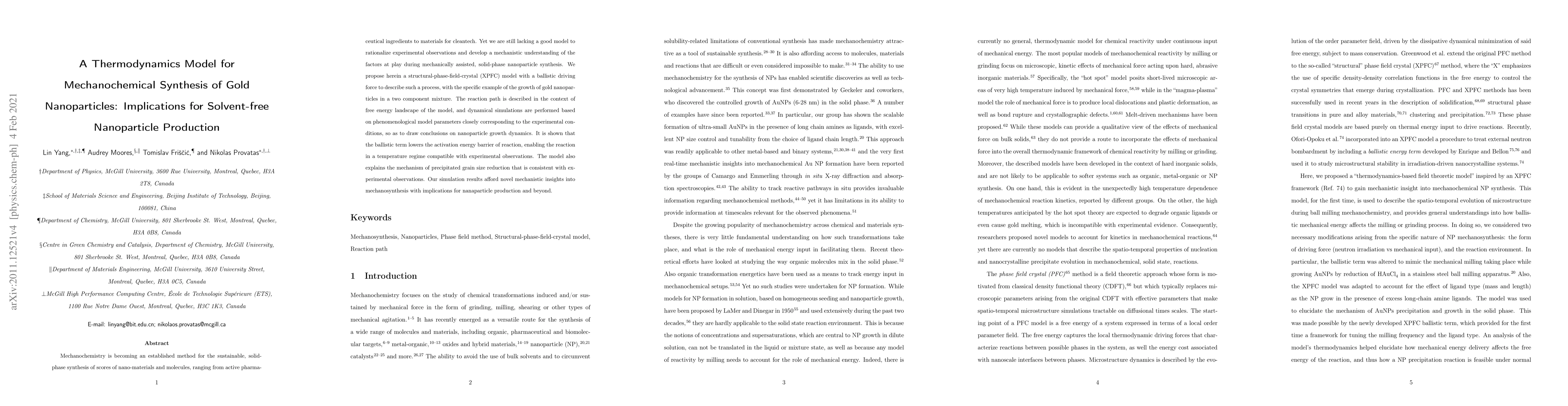 Mechanochemistry is becoming an established method for the sustainable, solid-phase synthesis of scores of nano-materials and molecules, ranging from active pharmaceutical ingredients to materials for cleantech. Yet we are still lacking a good model to rationalize experimental observations and develop a mechanistic understanding of the factors at play during mechanically assisted, solid-phase nanoparticle synthesis. We propose herein a structural-phase-field-crystal (XPFC) model with a ballistic driving force to describe such a process, with the specific example of the growth of gold nanoparticles in a two component mixture. The reaction path is described in the context of free energy landscape of the model, and dynamical simulations are performed based on phenomenological model parameters closely corresponding to the experimental conditions, so as to draw conclusions on nanoparticle growth dynamics. It is shown that the ballistic term lowers the activation energy barrier of reaction, enabling the reaction in a temperature regime compatible with experimental observations. The model also explains the mechanism of precipitated grain size reduction that is consistent with experimental observations. Our simulation results afford novel mechanistic insights into mechanosynthesis with implications for nanaparticle production and beyond.