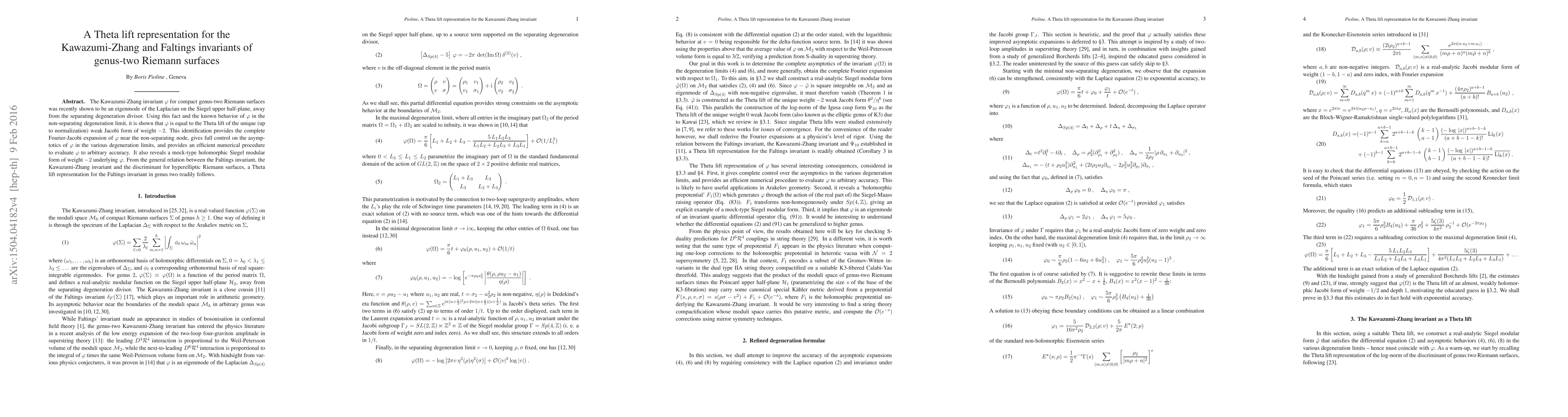 The Kawazumi-Zhang invariant $\varphi$ for compact genus-two Riemann surfaces was recently shown to be a eigenmode of the Laplacian on the Siegel upper half-plane, away from the separating degeneration divisor. Using this fact and the known behavior of $\varphi$ in the non-separating degeneration limit, it is shown that $\varphi$ is equal to the Theta lift of the unique (up to normalization) weak Jacobi form of weight $-2$. This identification provides the complete Fourier-Jacobi expansion of $\varphi$ near the non-separating node, gives full control on the asymptotics of $\varphi$ in the various degeneration limits, and provides a efficient numerical procedure to evaluate $\varphi$ to arbitrary accuracy. It also reveals a mock-type holomorphic Siegel modular form of weight $-2$ underlying $\varphi$. From the general relation between the Faltings invariant, the Kawazumi-Zhang invariant and the discriminant for hyperelliptic Riemann surfaces, a Theta lift representation for the Faltings invariant in genus two readily follows.