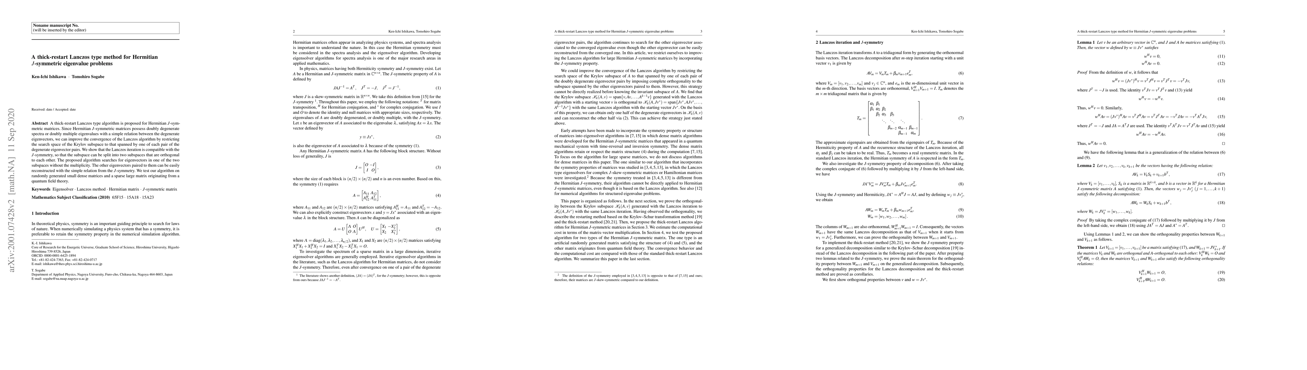 This paper proposes a thick-restart Lanczos type method for solving Hermitian $J$-symmetric eigenvalue problems, focusing on improving convergence by restricting the search to subspaces spanned by pairs of degenerate eigenvectors. The method is tested on small dense and a large sparse matrix from quantum field theory.