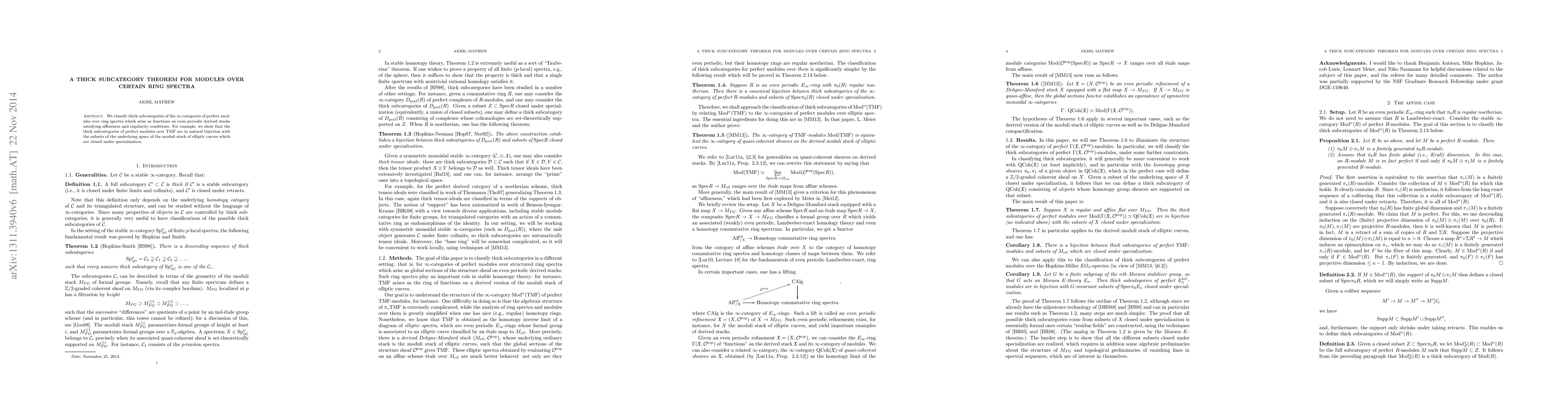 We classify thick subcategories of the $\infty$-categories of perfect modules over ring spectra which arise as functions on even periodic derived stacks satisfying affineness and regularity conditions. For example, we show that the thick subcategories of perfect modules over $\mathrm{TMF}$ are in natural bijection with the subsets of the underlying space of the moduli stack of elliptic curves which are closed under specialization.